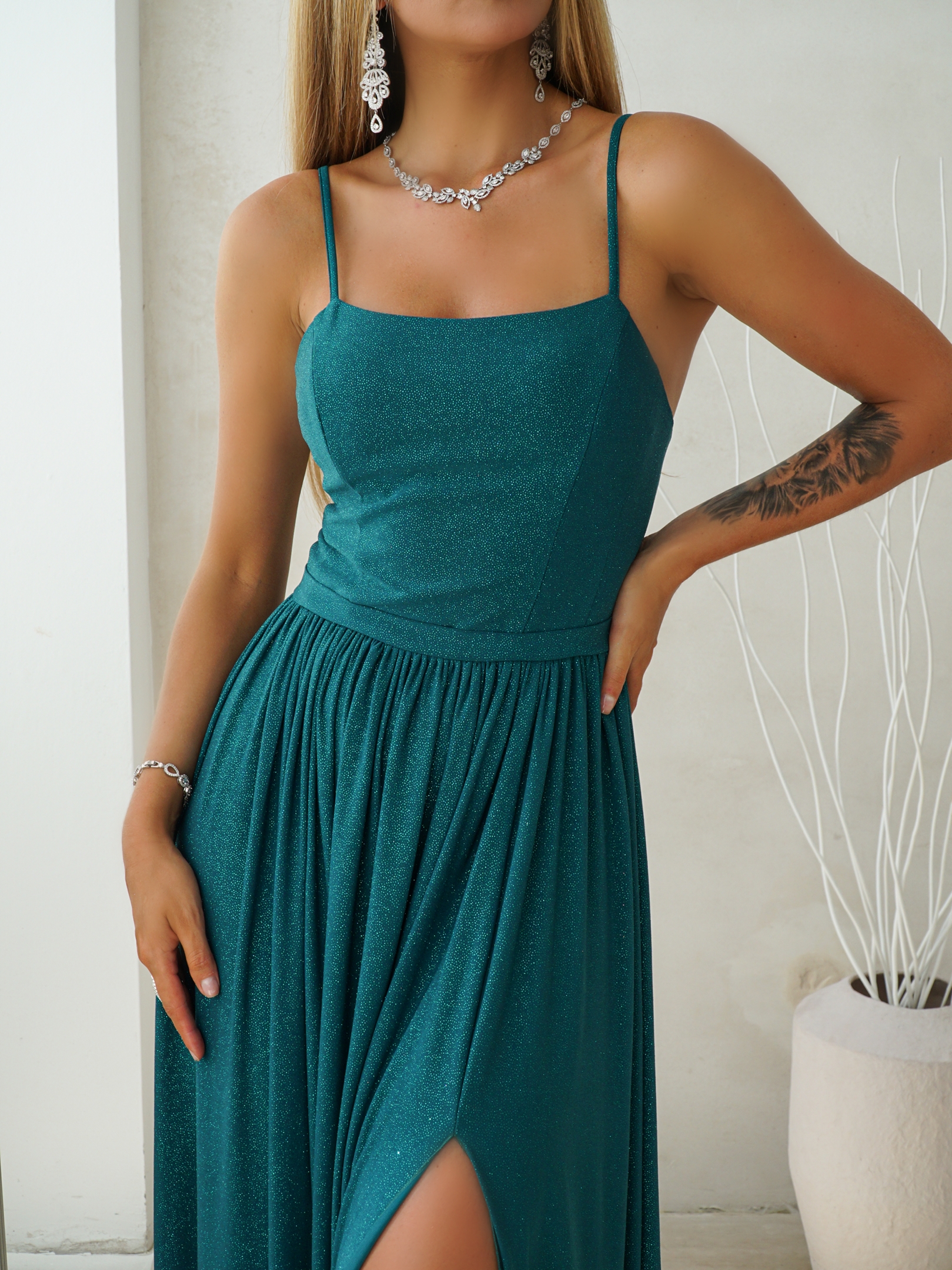 Fantastyczna sukienka wieczorowa o długości maxi. Uszyta z brokatowego materiału wysokiej jakości.
