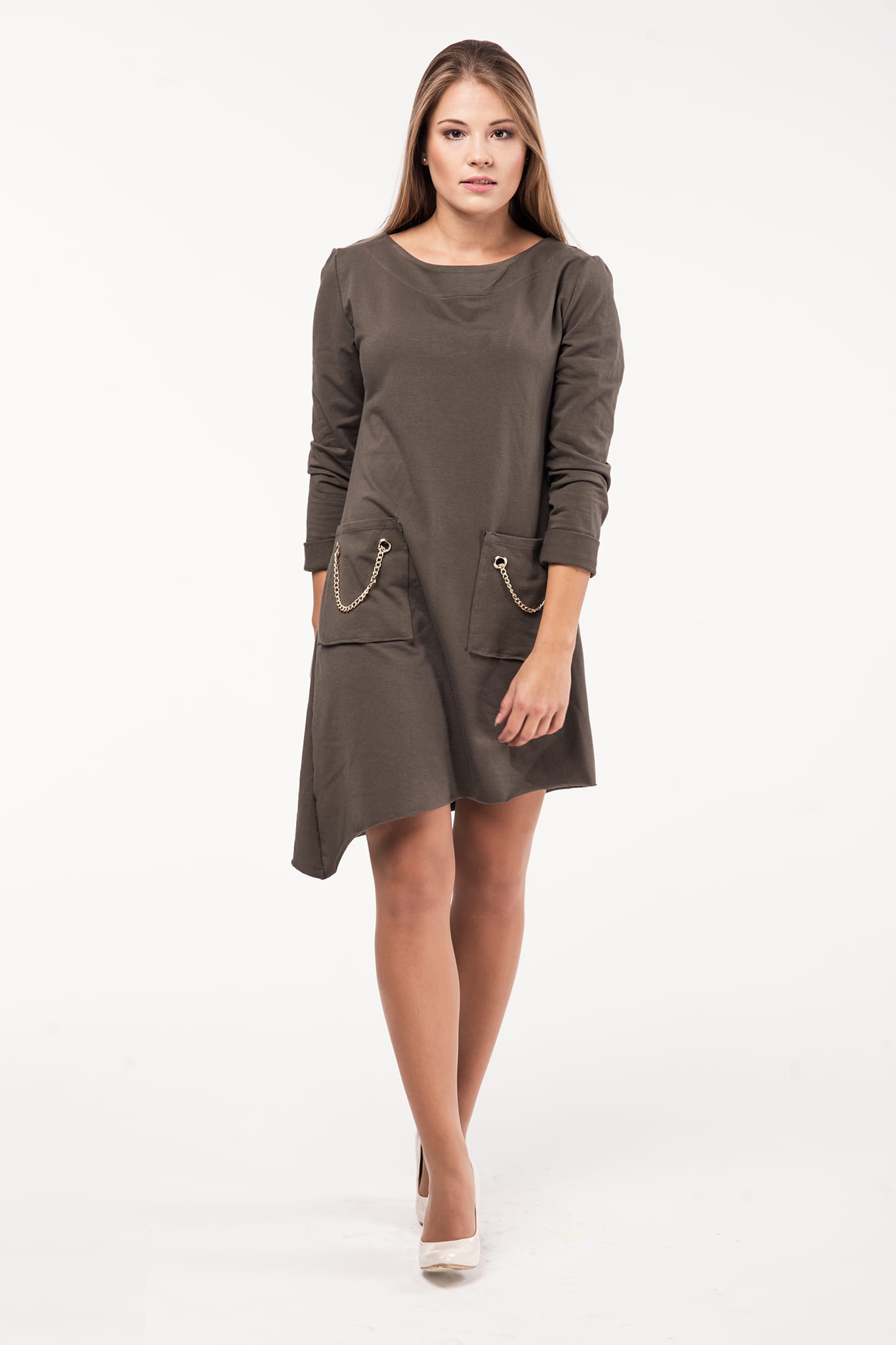 Sukienka o asymetrycznym, modnym kroju, z ozdobnym łańcuszkami - przeplecionymi w kieszeniach.