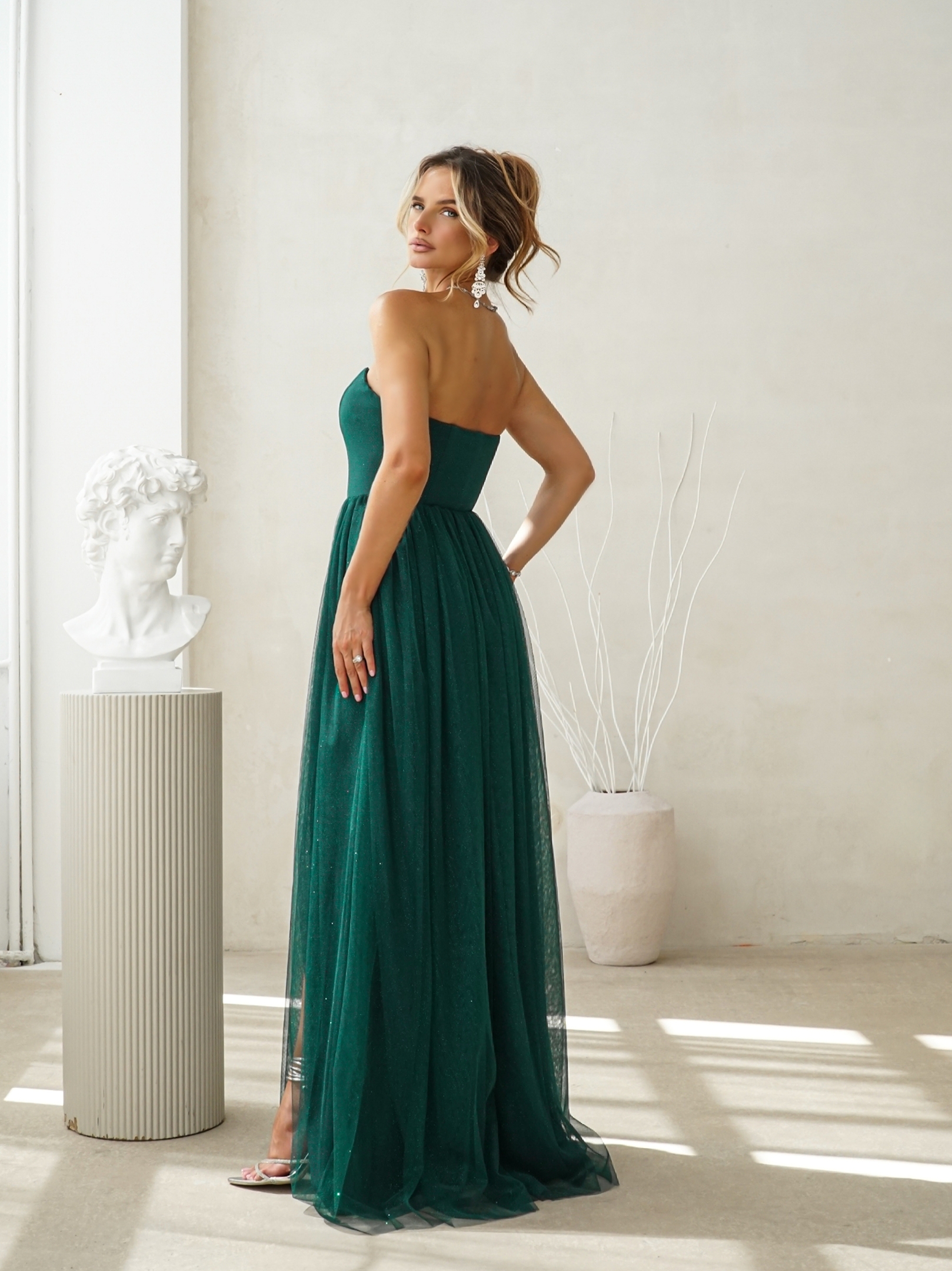 Gorsetowa góra świetnie modeluje sylwetkę. Sukienka ma wszytą elastyczną gumkę w gorsecie, dzięki czemu idealnie się dopasowuje.