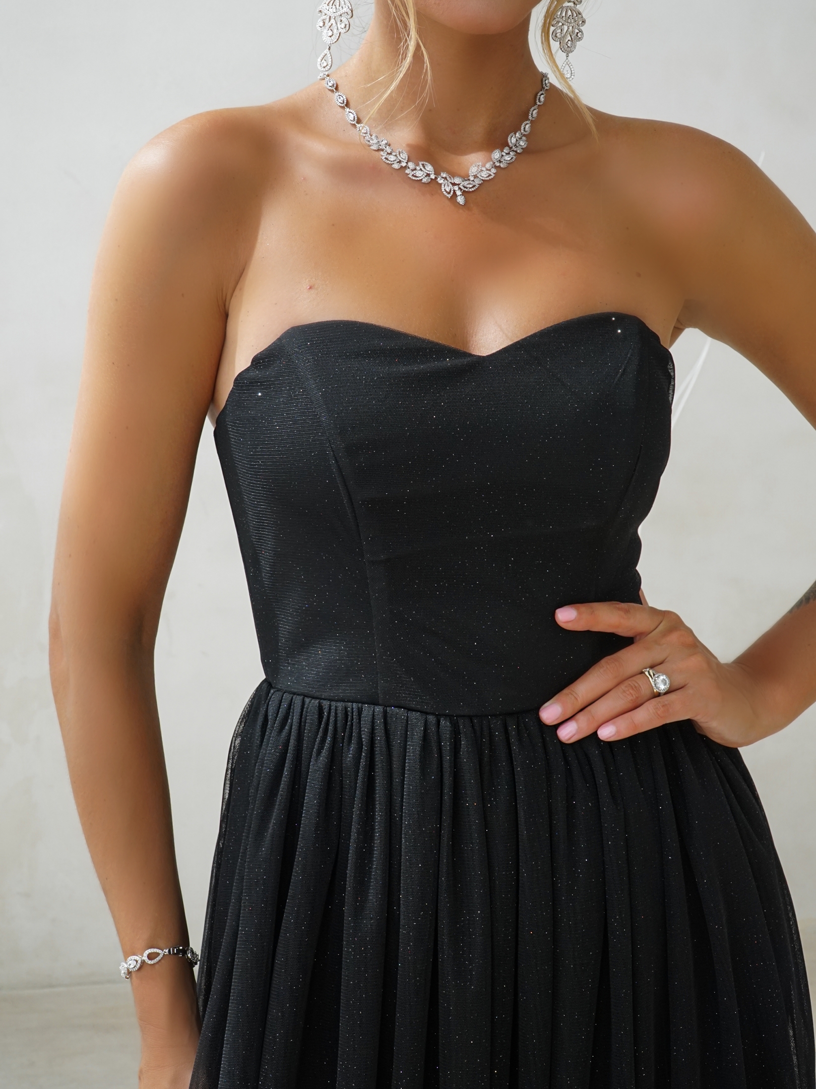 Uszyta z wysokiej jakości błyszczącej siateczki z brokatem, która pięknie odbija światło.