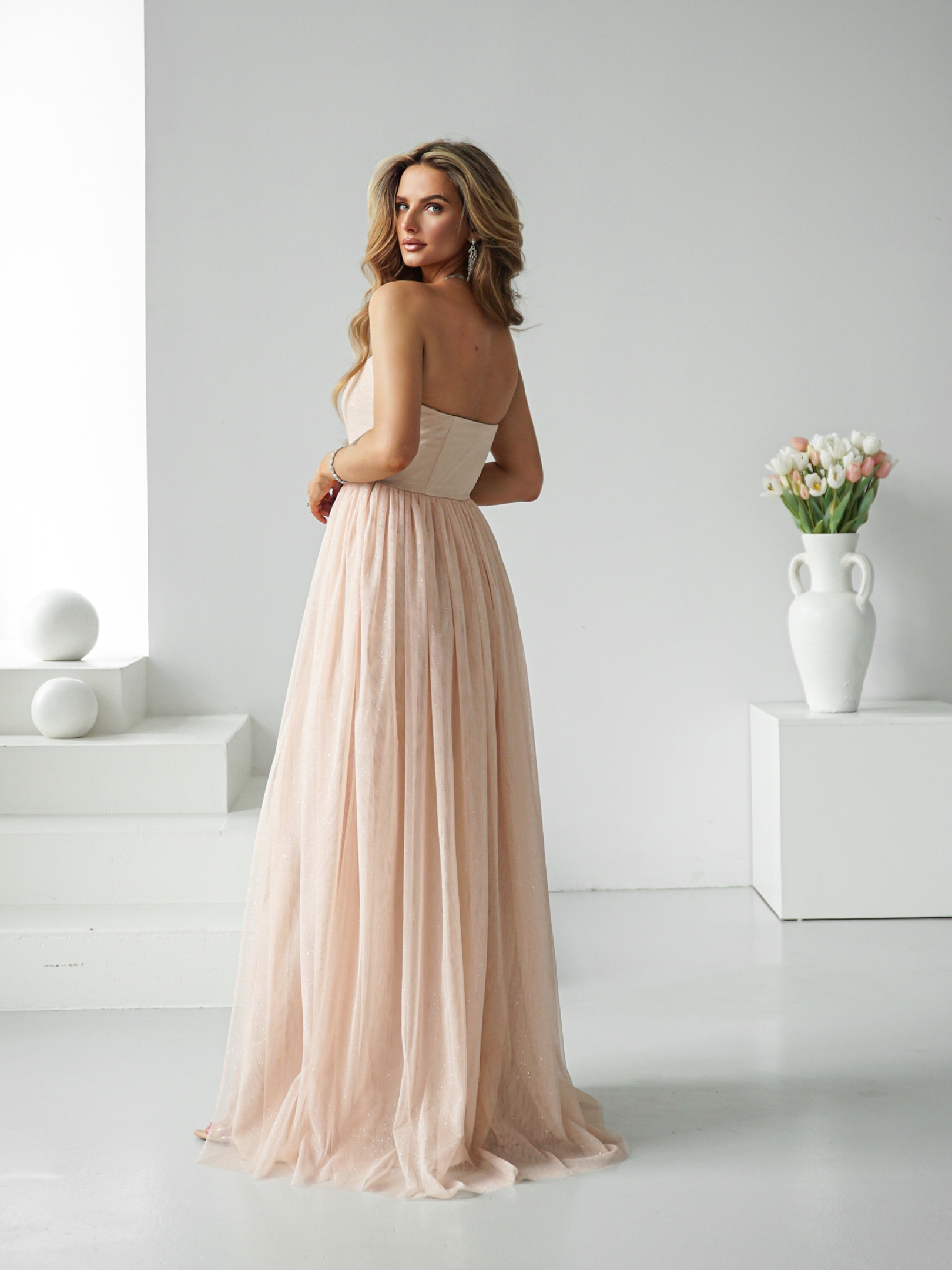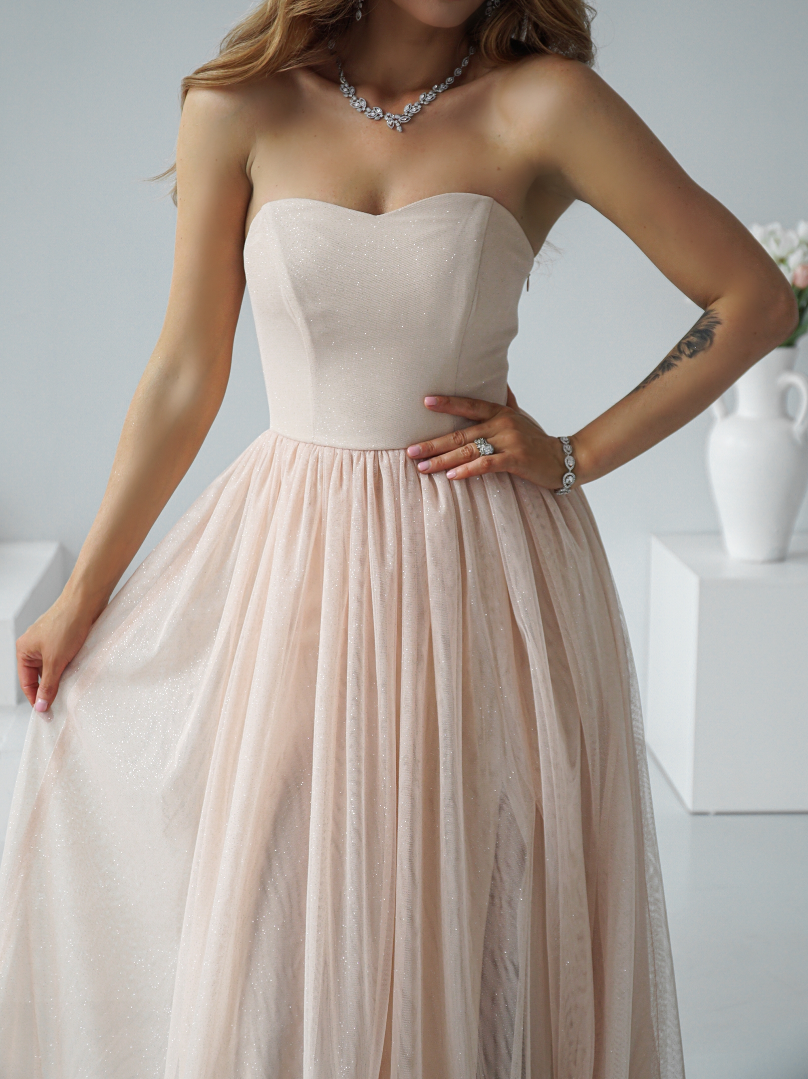 Uszyta z wysokiej jakości błyszczącej siateczki z brokatem, która pięknie odbija światło.