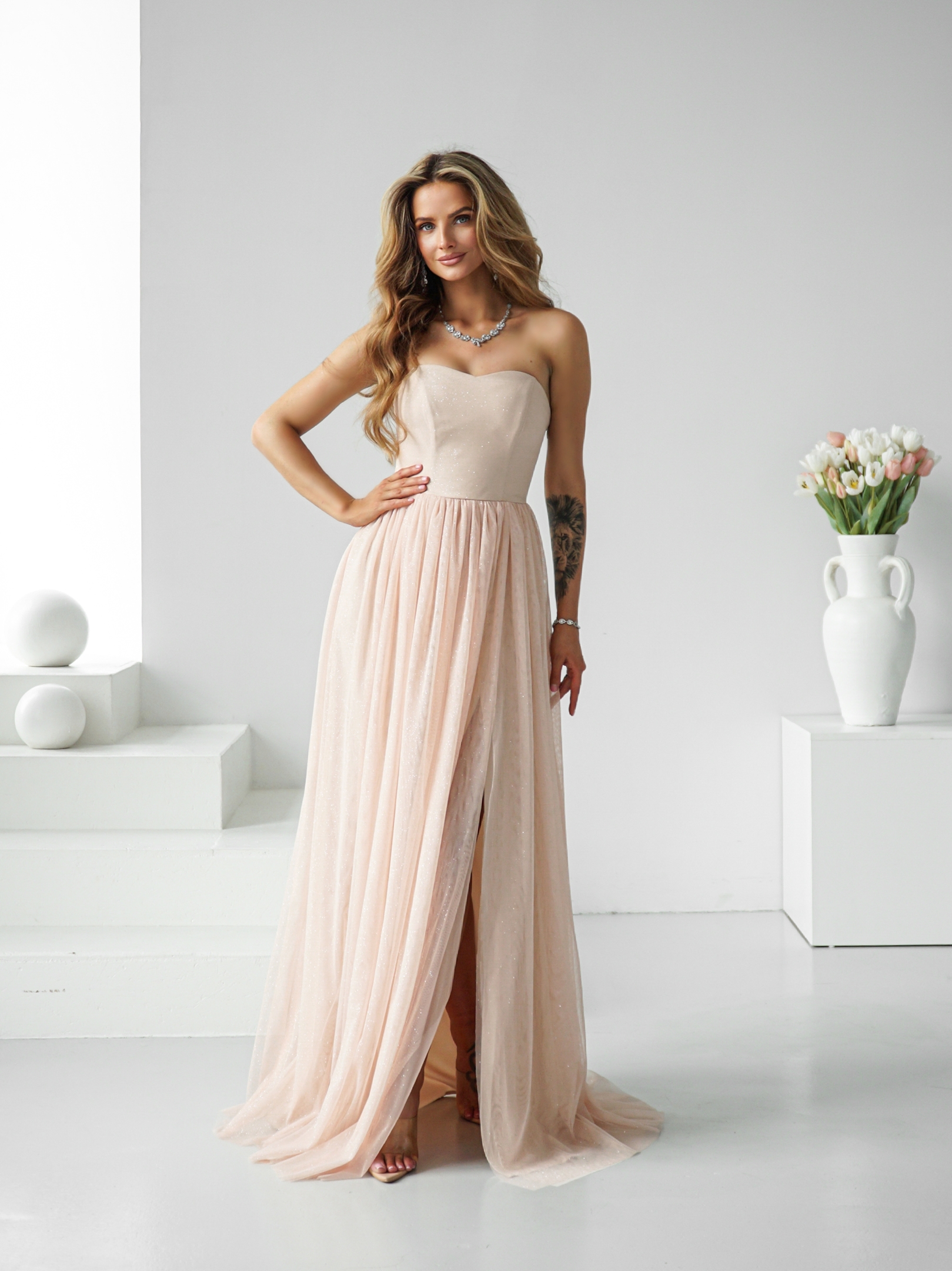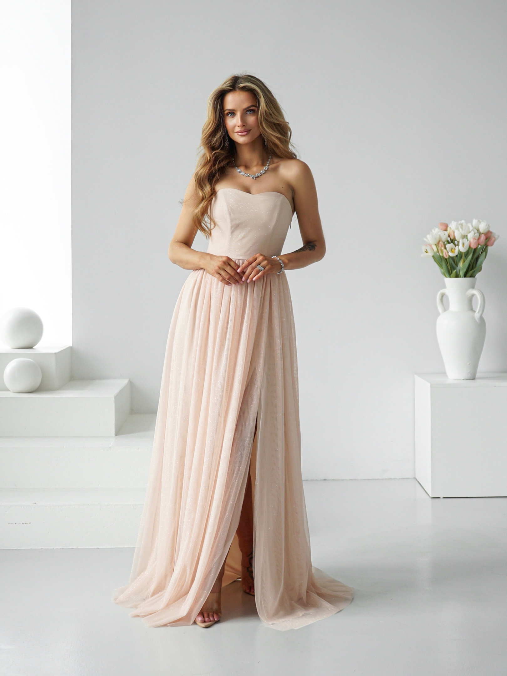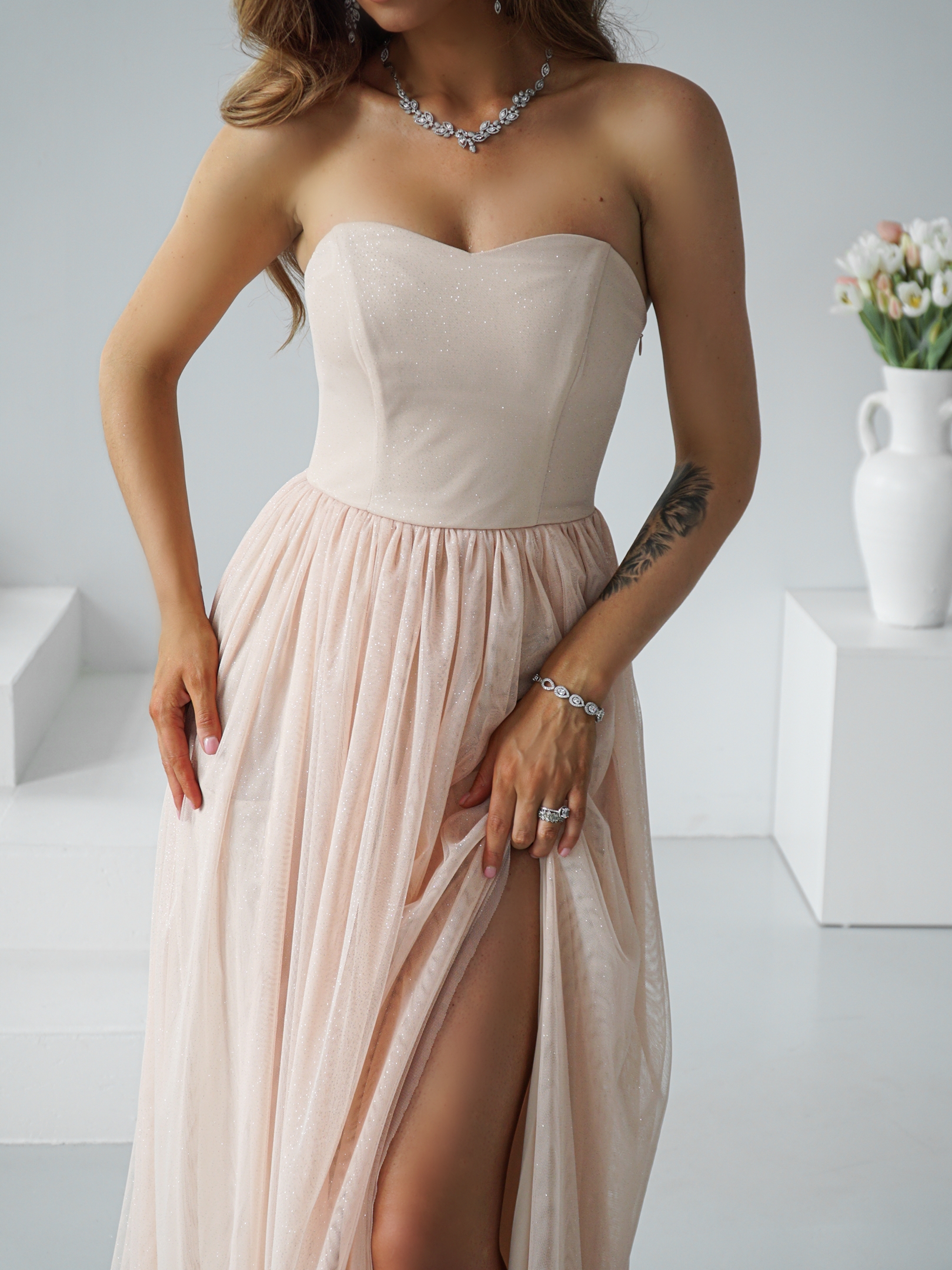 Zjawiskowa długa suknia z gorsetową górą i rozcięciem!