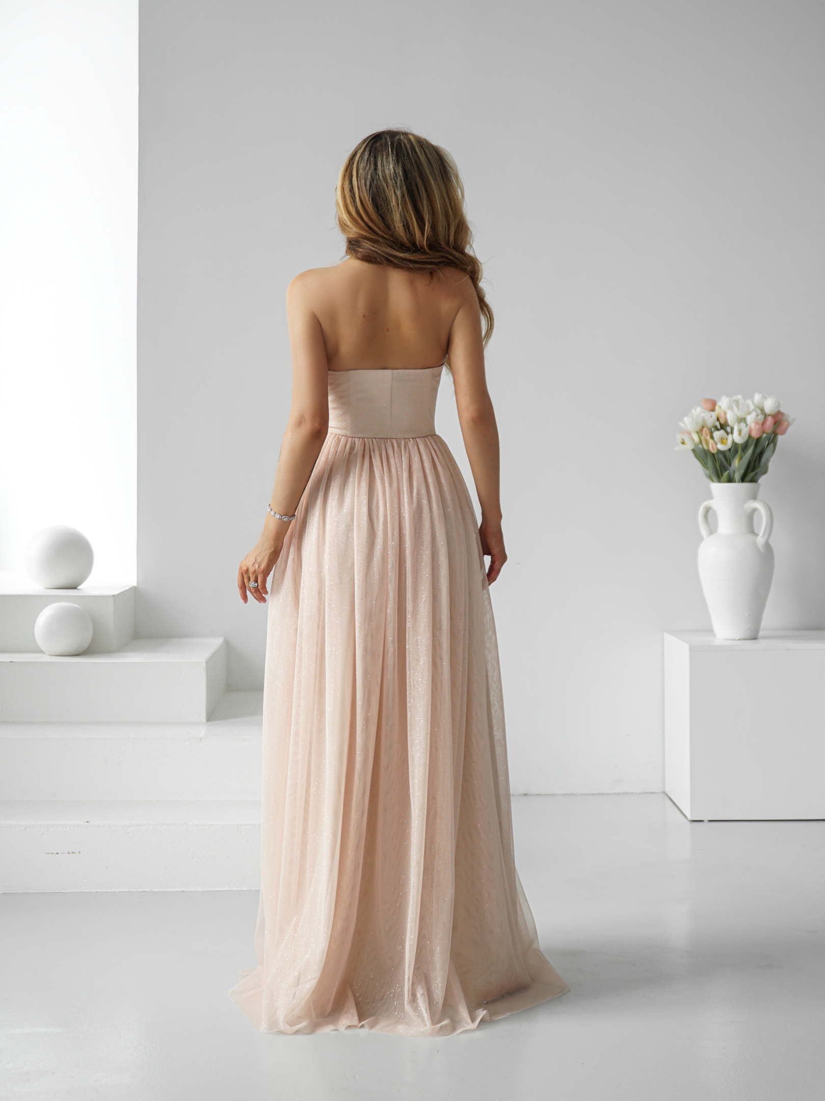 Gorsetowa góra świetnie modeluje sylwetkę. Sukienka ma wszytą elastyczną gumkę w gorsecie, dzięki czemu idealnie się dopasowuje.