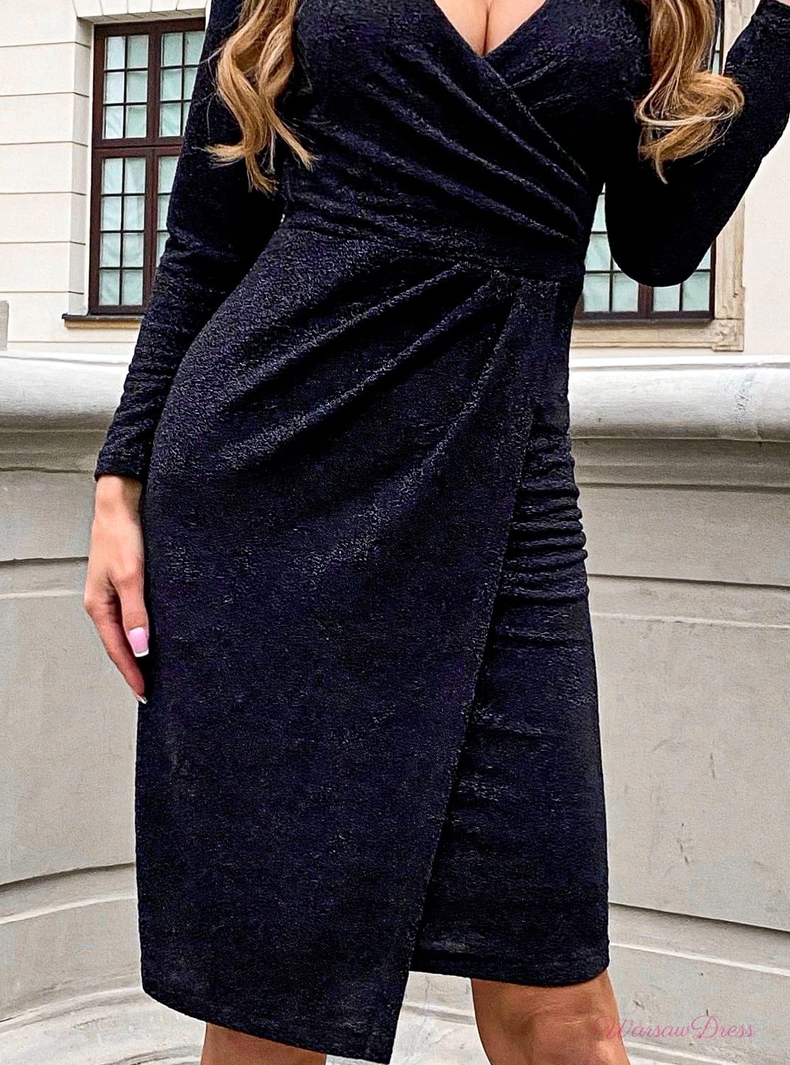 Kopertowy dekolt w kształcie litry V doskonale podkreśla biust. Zakładki na biodrach świetnie maskują niedoskonałości sylwetki. Długość przed kolano kładzie delikatny akcent na nogi, optycznie je wysmuklając.