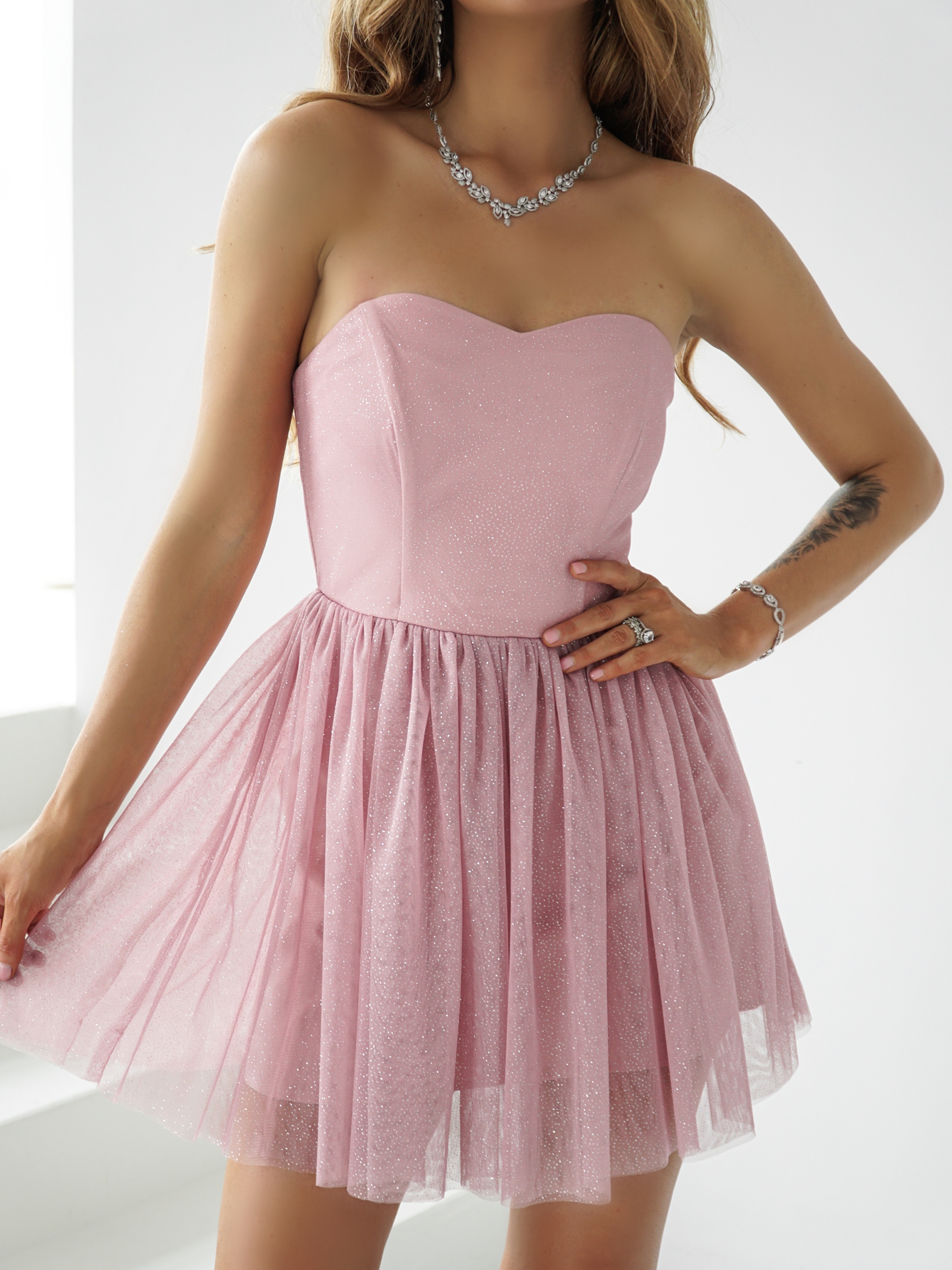 Gorsetowa góra z dekoltem w kształcie serca pięknie podkreśla biust i sylwetkę. Wysokiej jakości tiul z brokatem dodaje kreacji blasku.