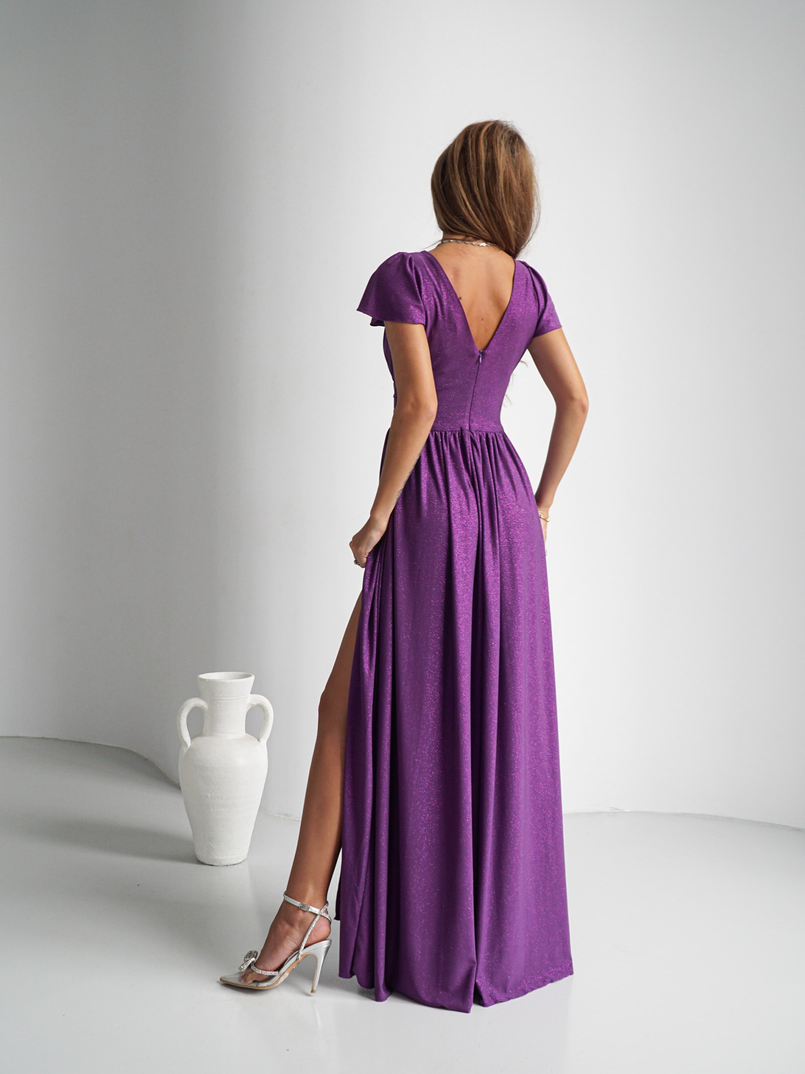 Efektowna sukienka maxi z głębokim dekoltem i rozcięciem.
