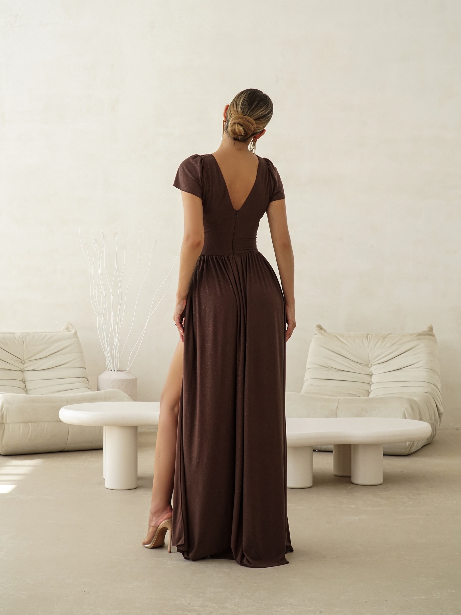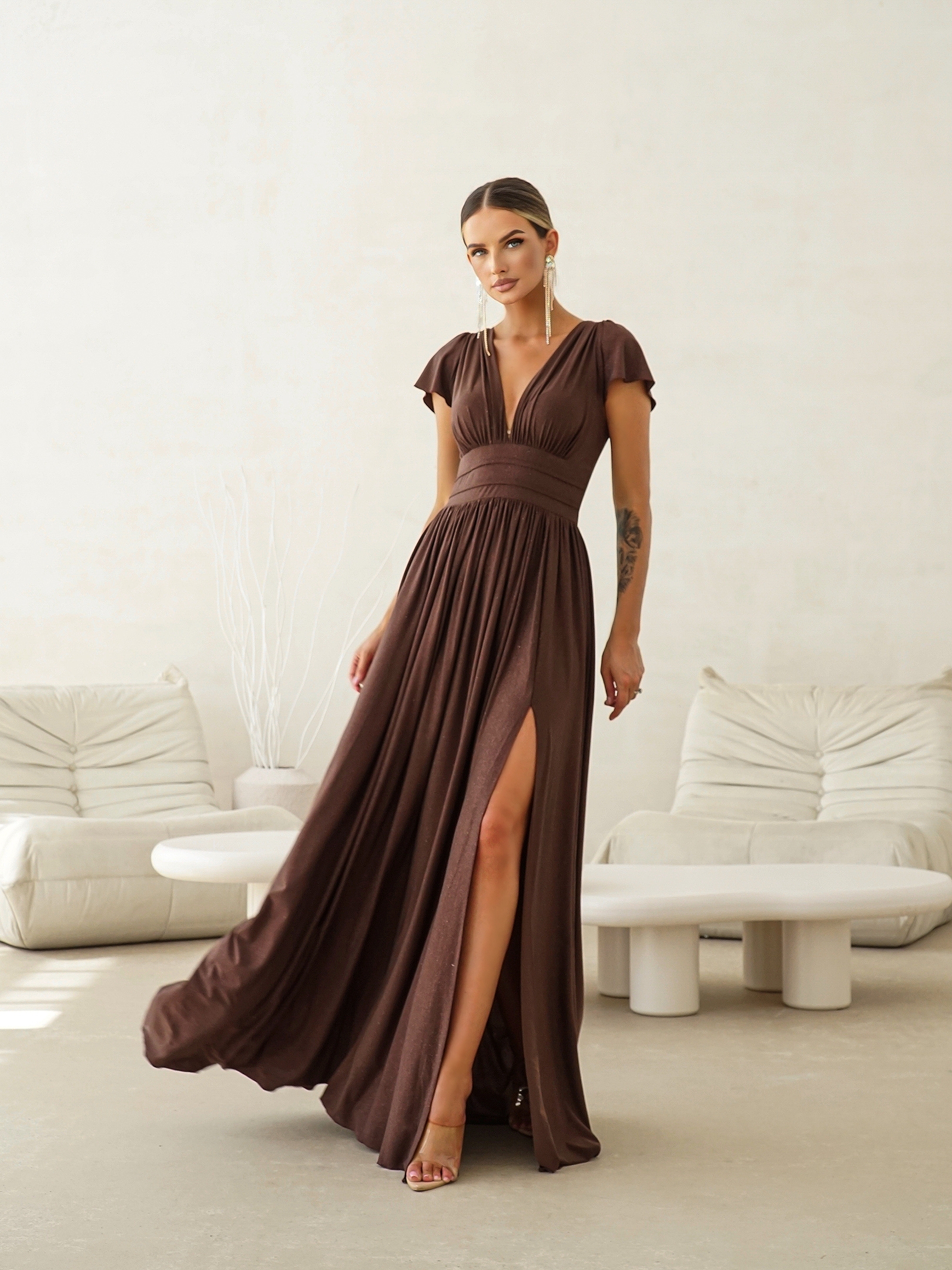 Efektowna sukienka maxi z głębokim dekoltem i rozcięciem.