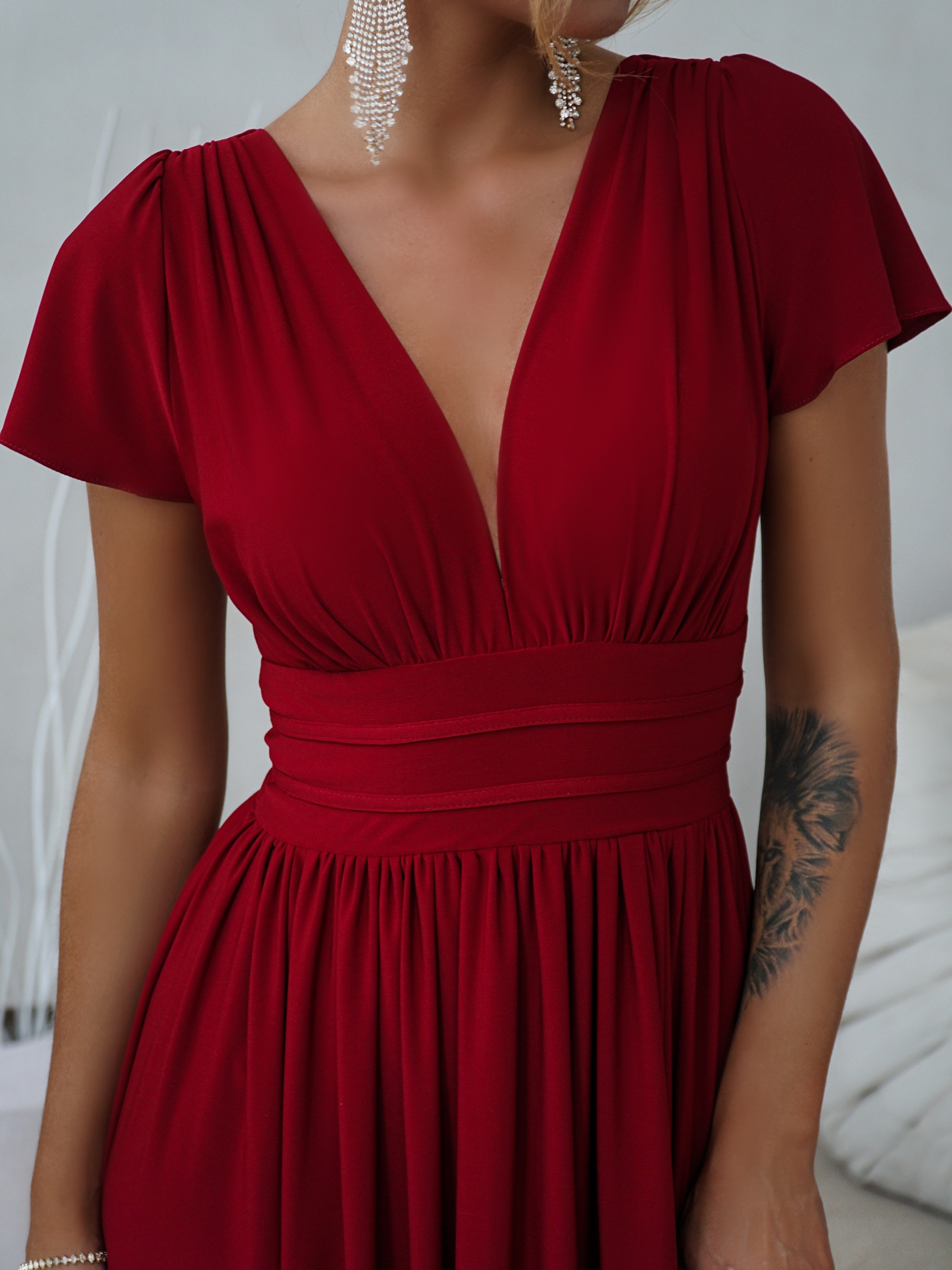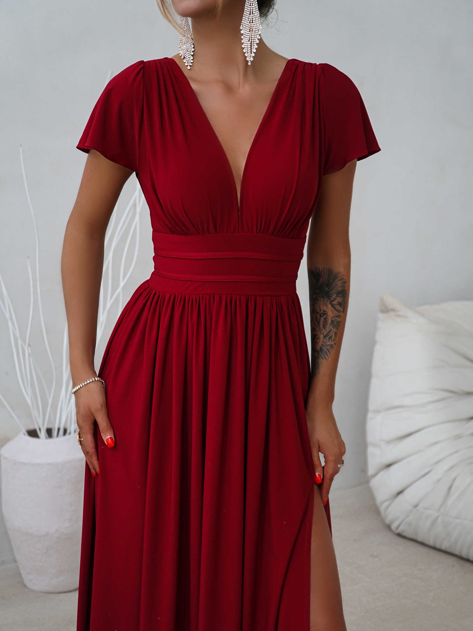 Efektowna sukienka maxi z głębokim dekoltem i rozcięciem.
