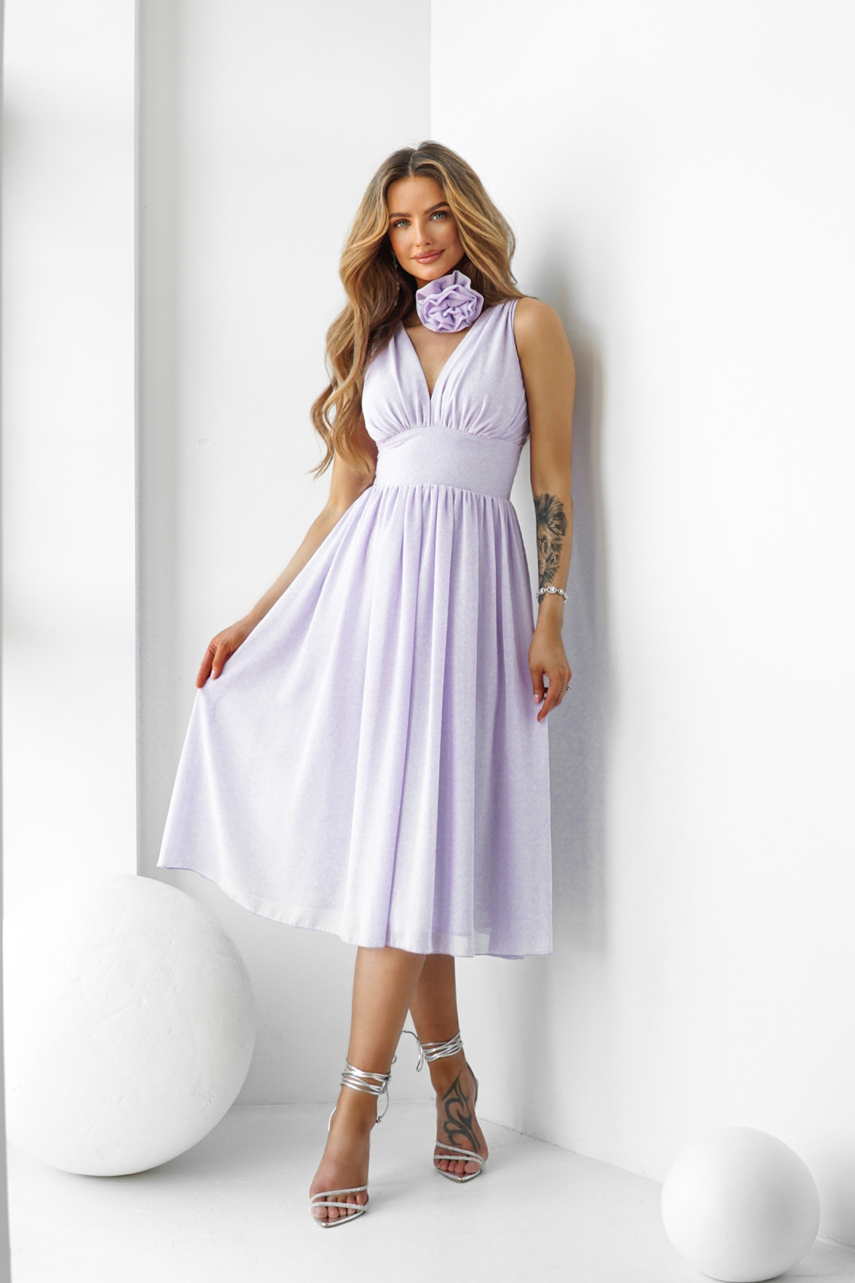Subtelna i romantyczna sukienka uszyta z wysokiej jakości szyfonu. Doskonale dopasowany krój podkreśla kobiece kształty a długość midi podkreśla jej kobiecy styl. Odkryte ramiona dodają lekkości i delikatności. Sukienka pięknie podkreśla talię i dekolt, sprawiając, że każda kobieta poczuje się pewnie i wyjątkowo w tej sukience.