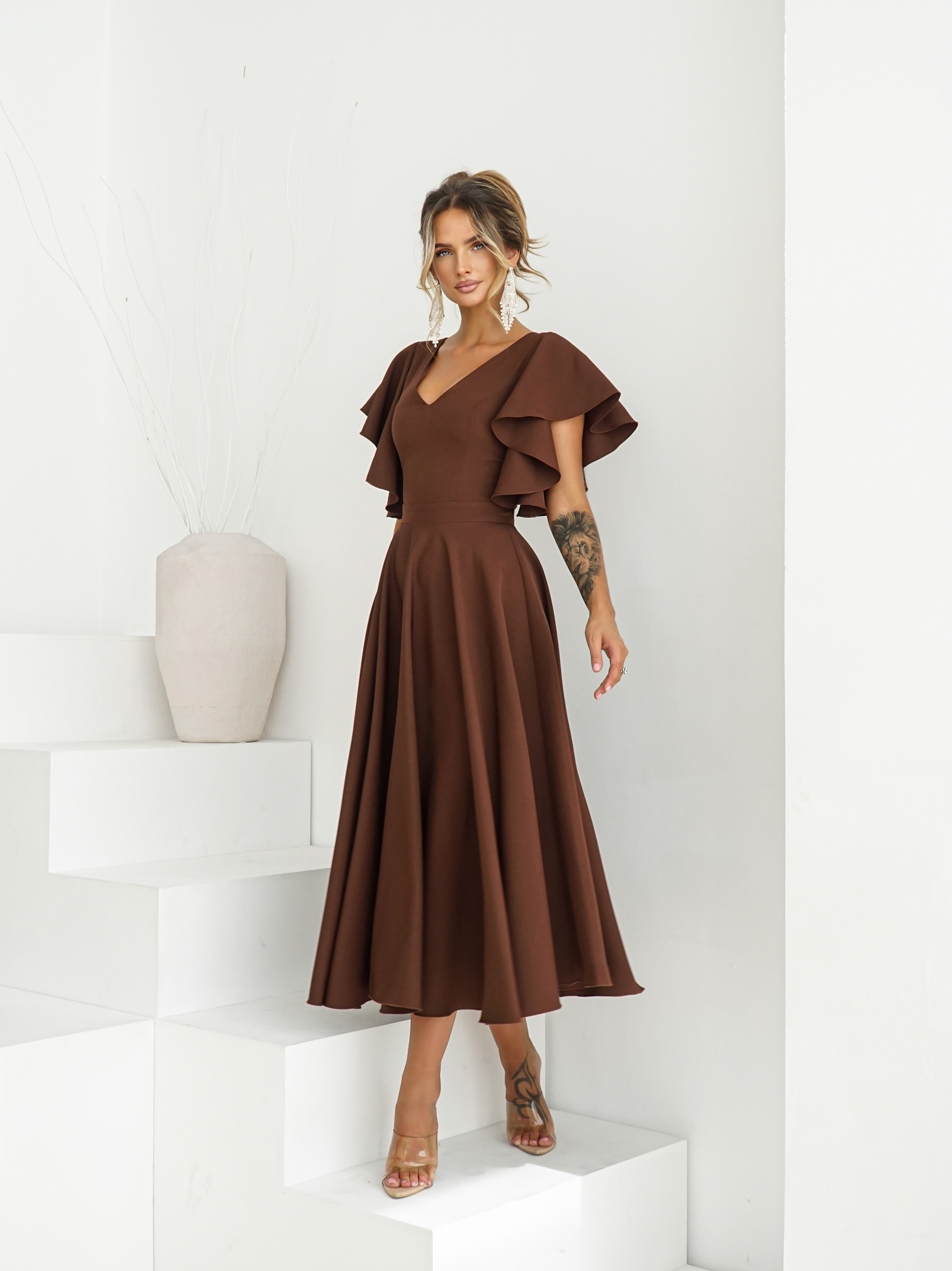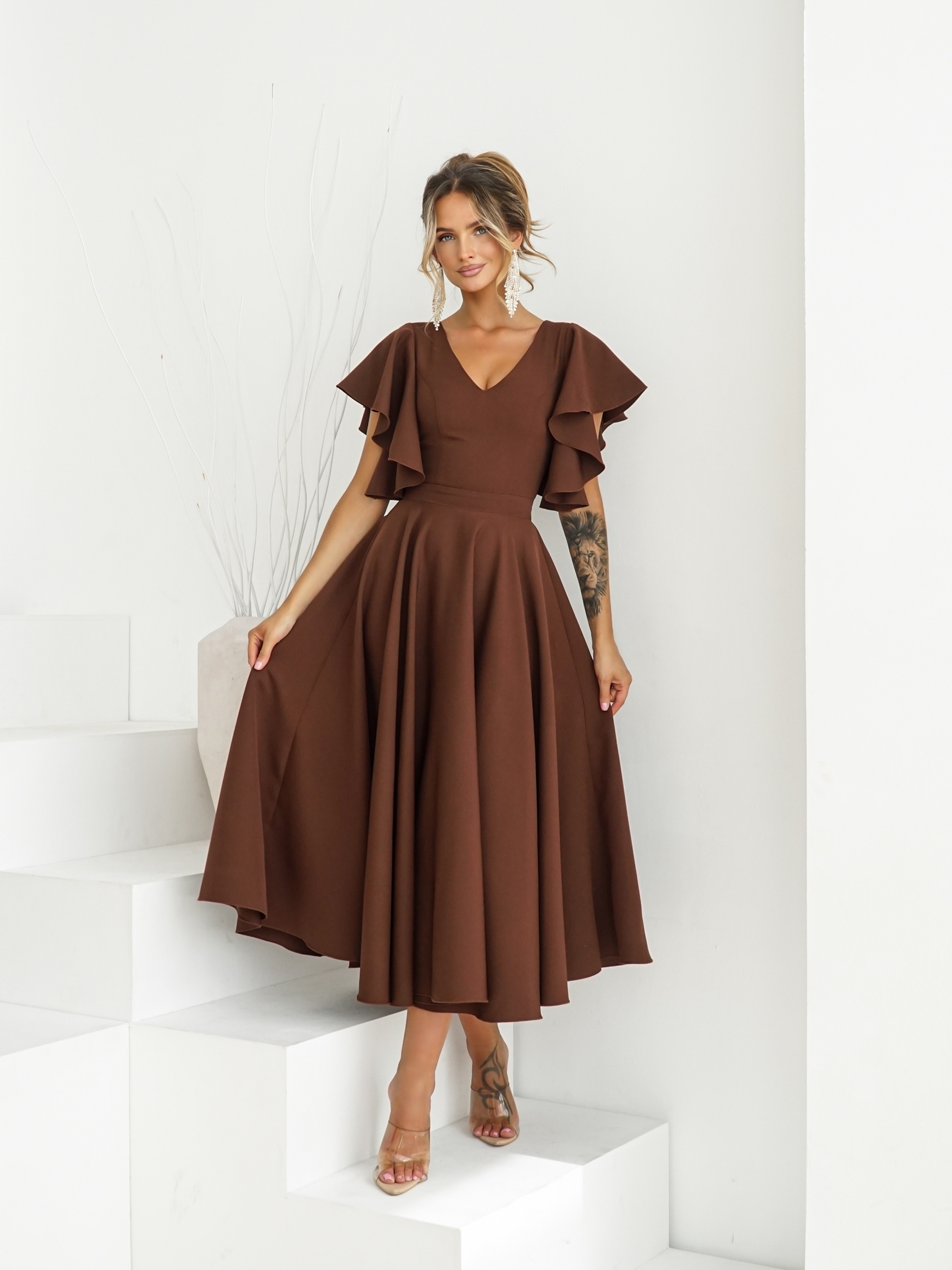 Piękna suknia z rękawami układającymi się w urocze falbanki.