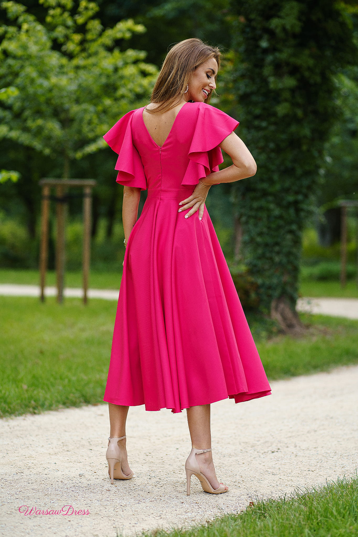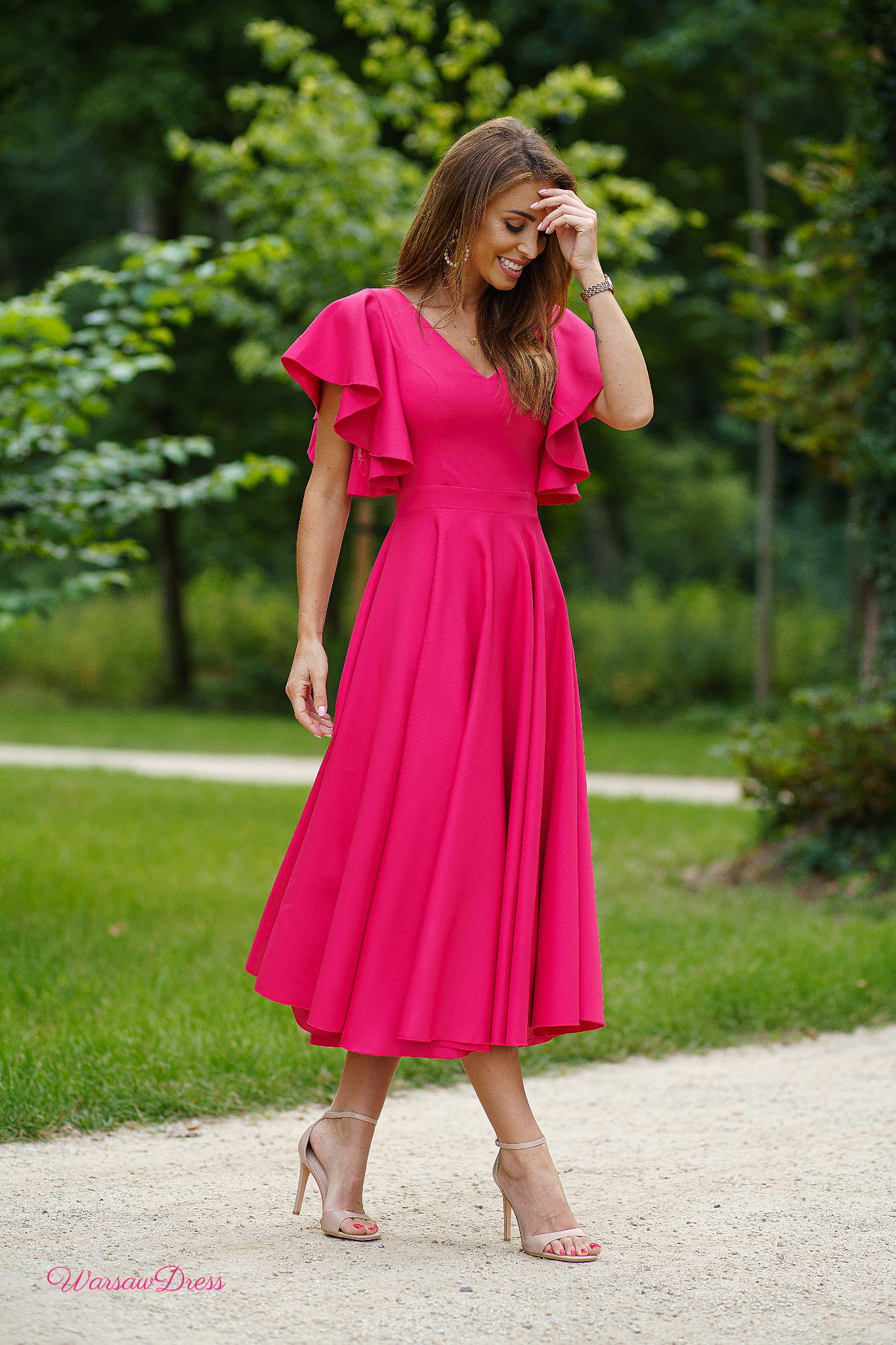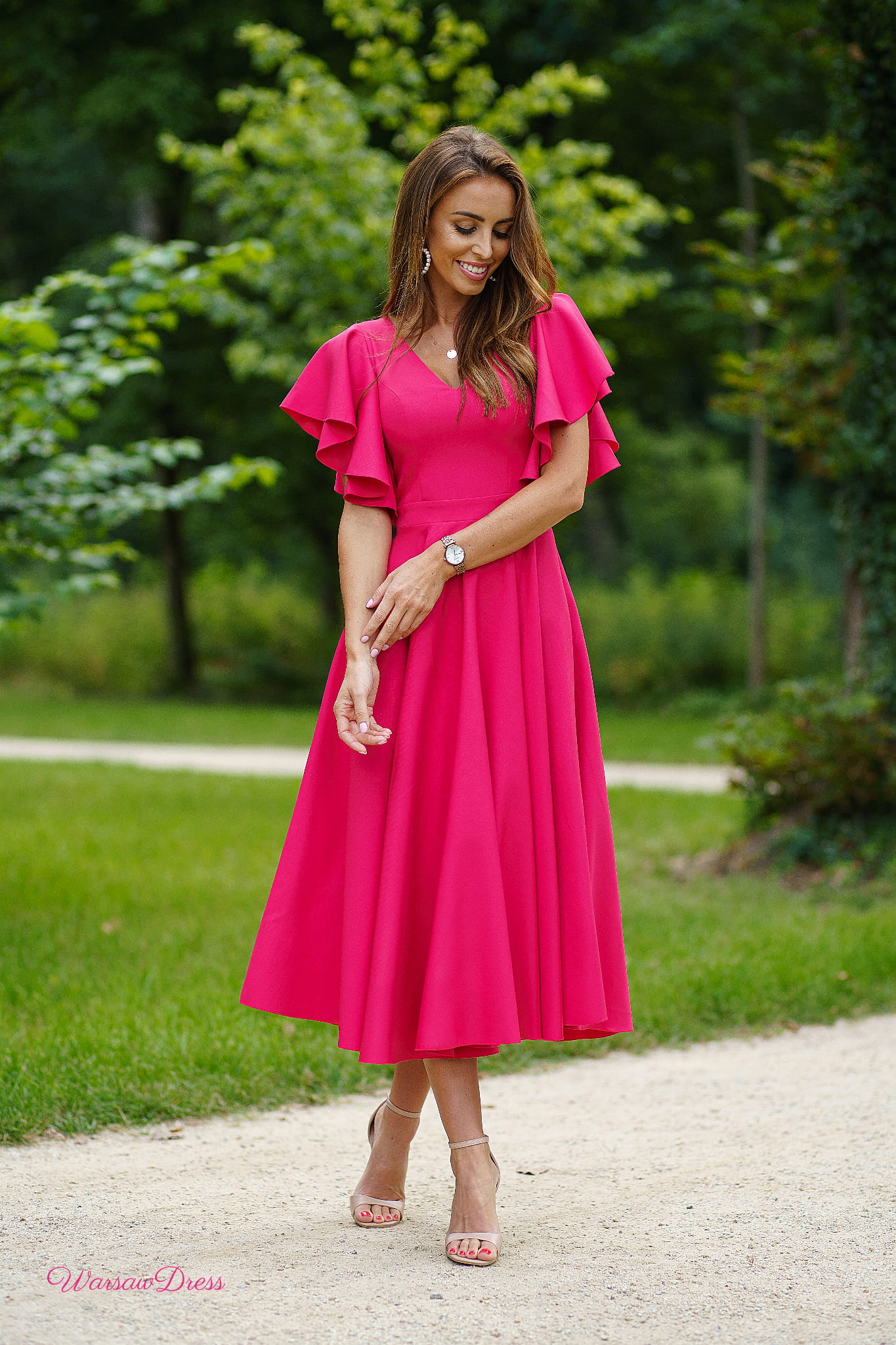 Piękna suknia z rękawami układającymi się w urocze falbanki.