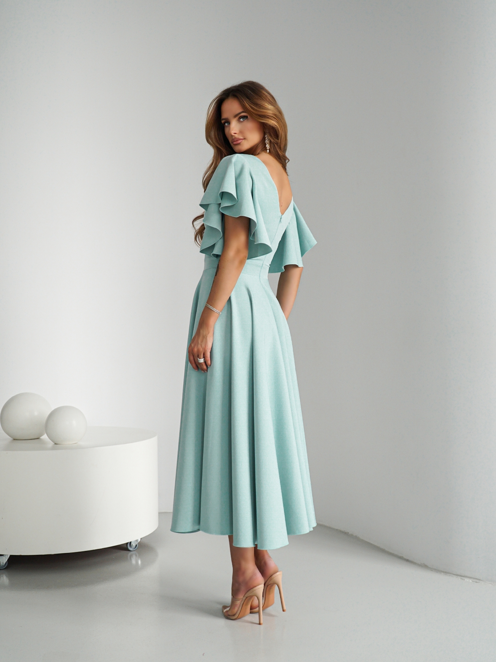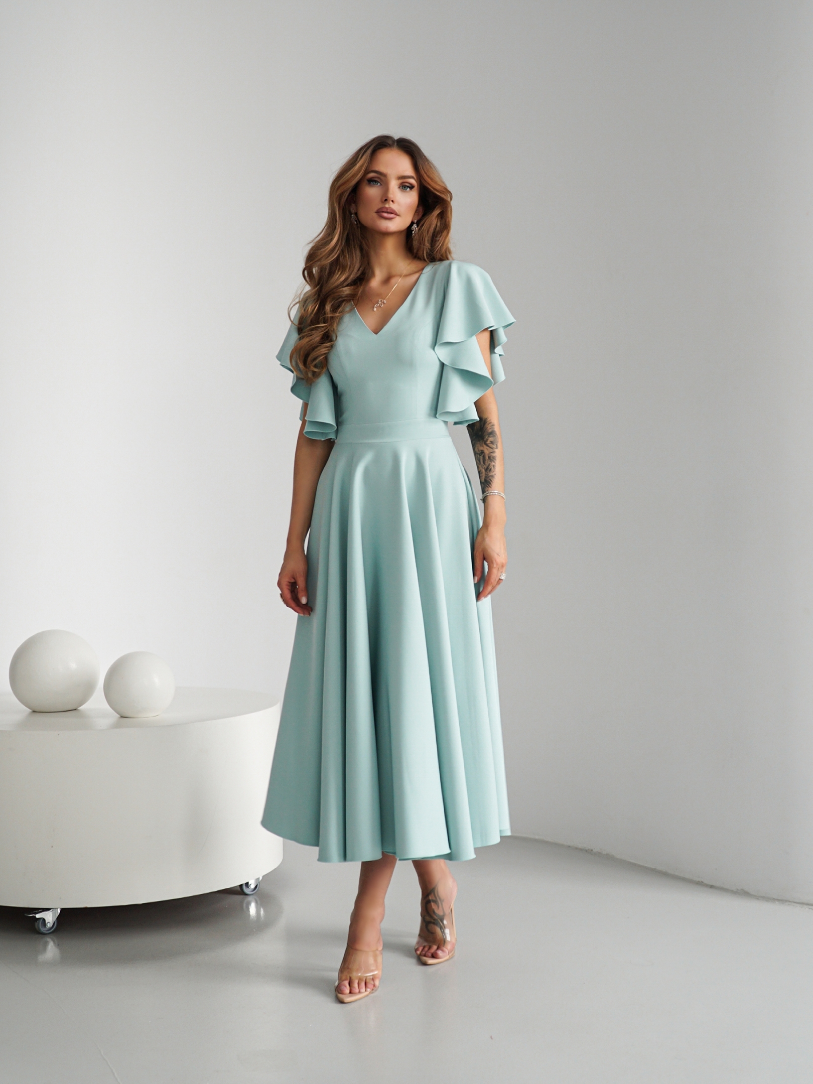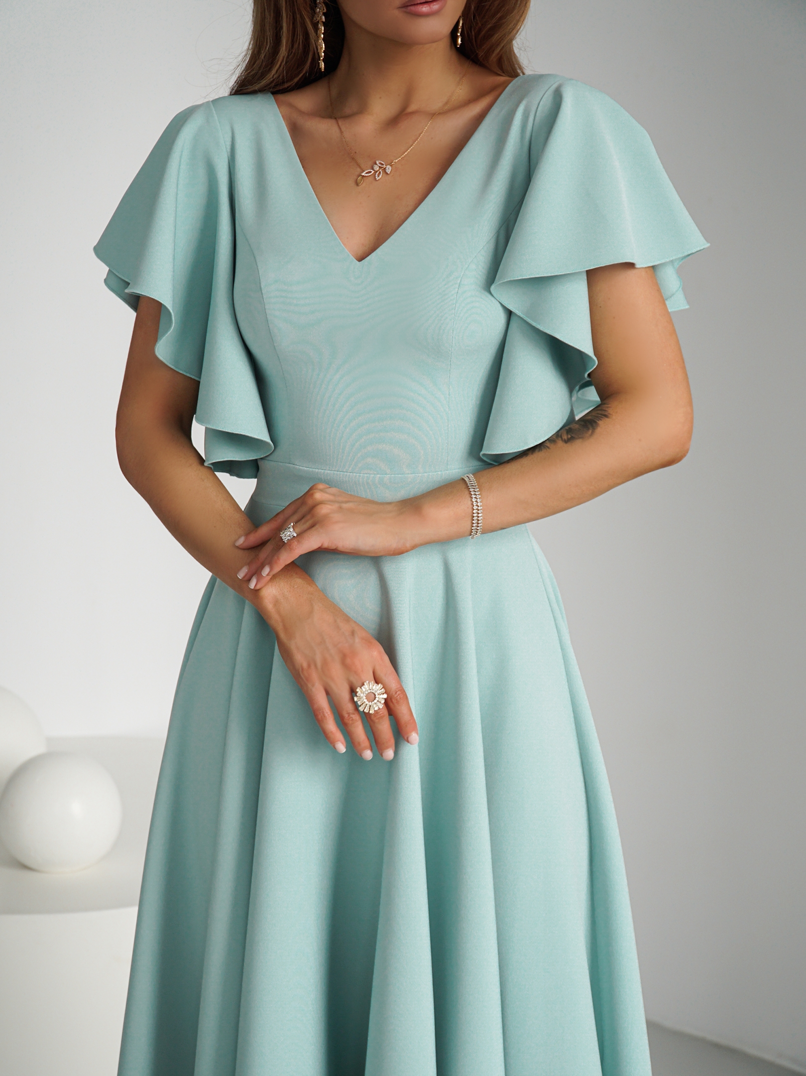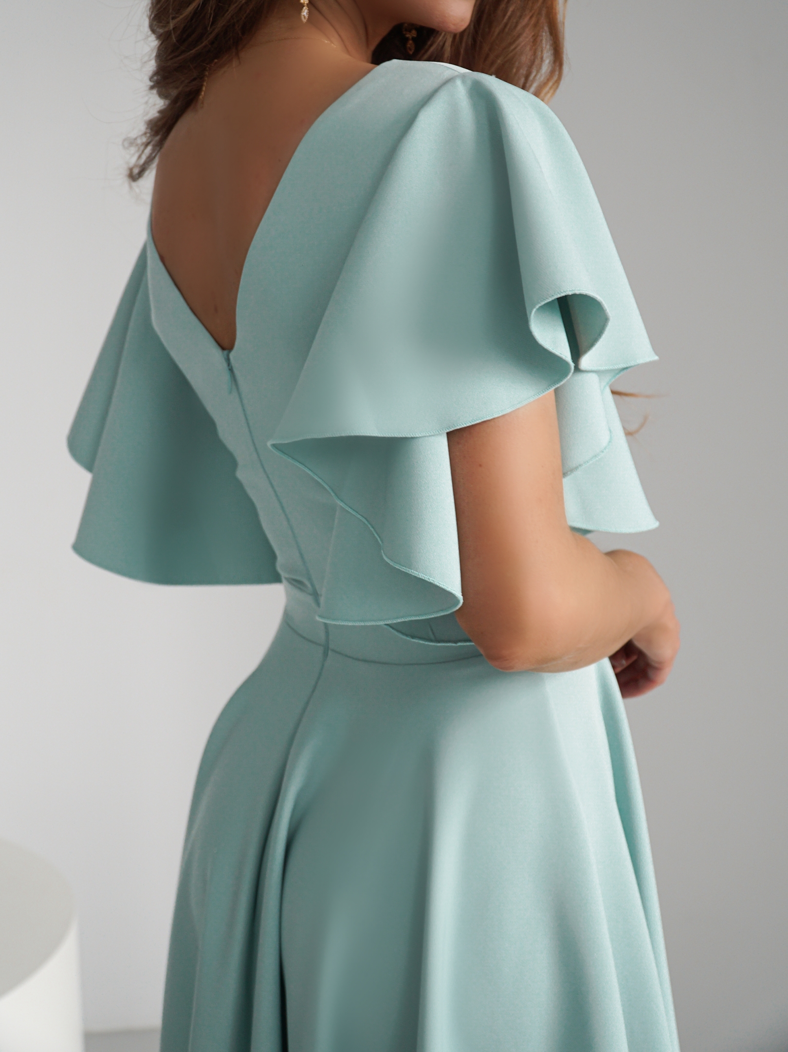 Piękna suknia z rękawami układającymi się w urocze falbanki.