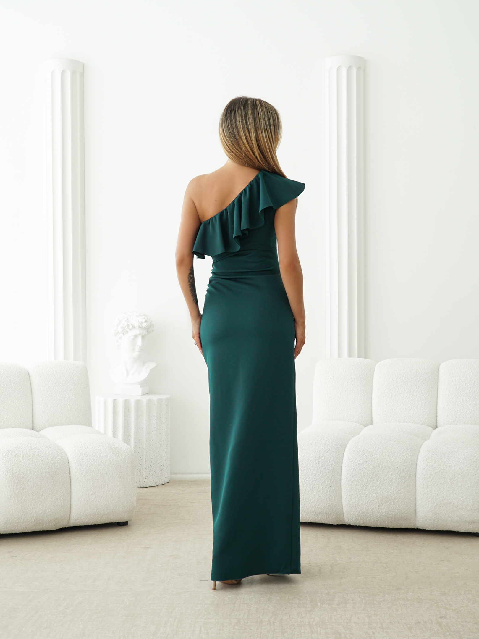 Sukienka w głębokim intensywnym kolorze. Posiada marszczenia na wysokości bioder, które idealnie tuszuje ewentualne niedoskonałości sylwetki.