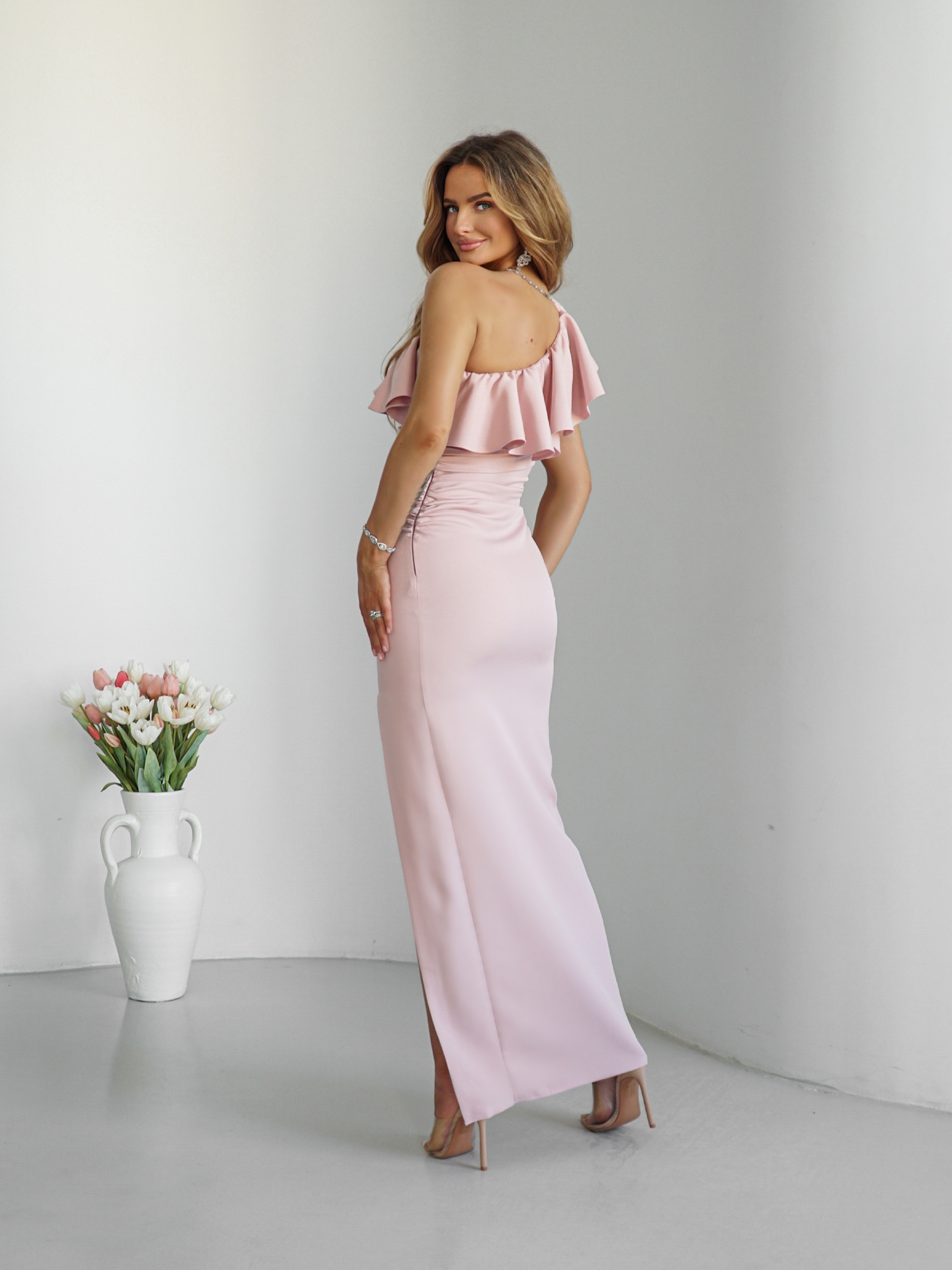 Dopasowana sukienka maxi na jedno ramię.