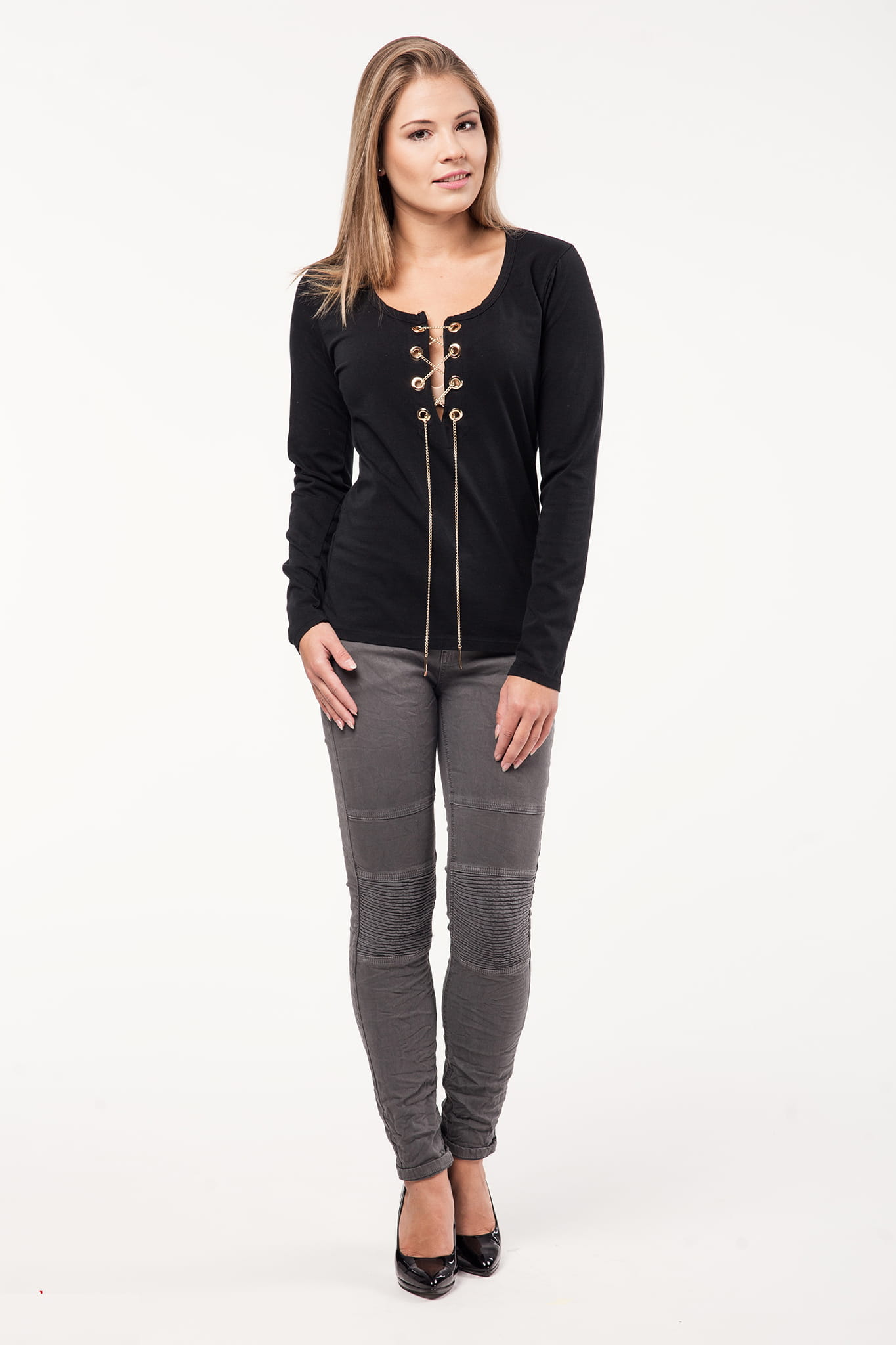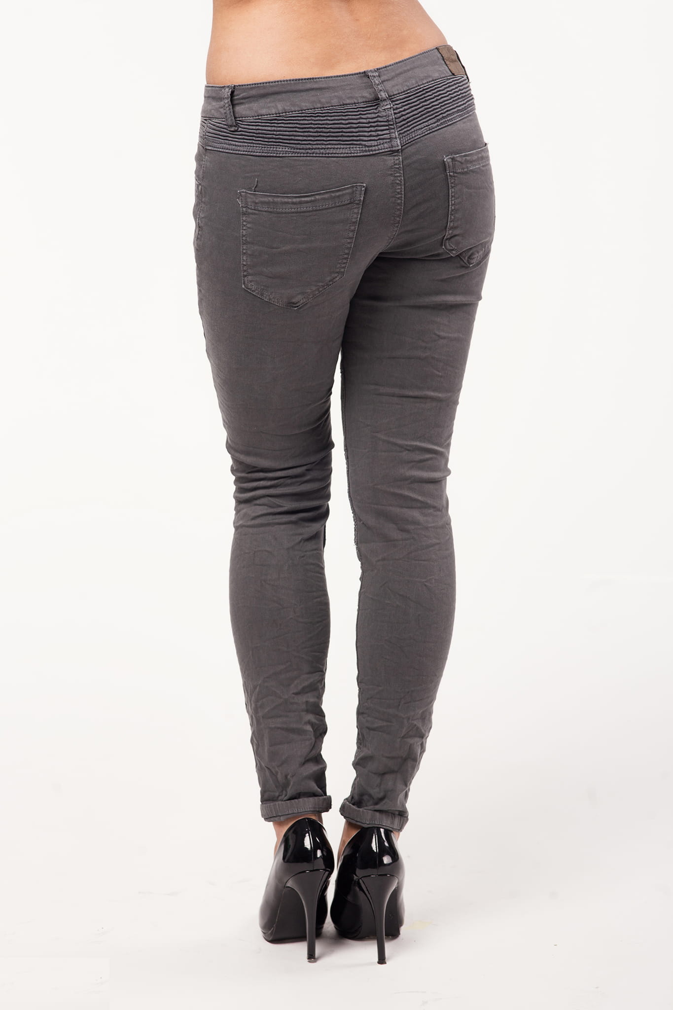 Rewelacyjnie skrojone, dopasowane włoskie jeansy. Spodnie z modnymi akcentami - przeszycia i marszczenia.
