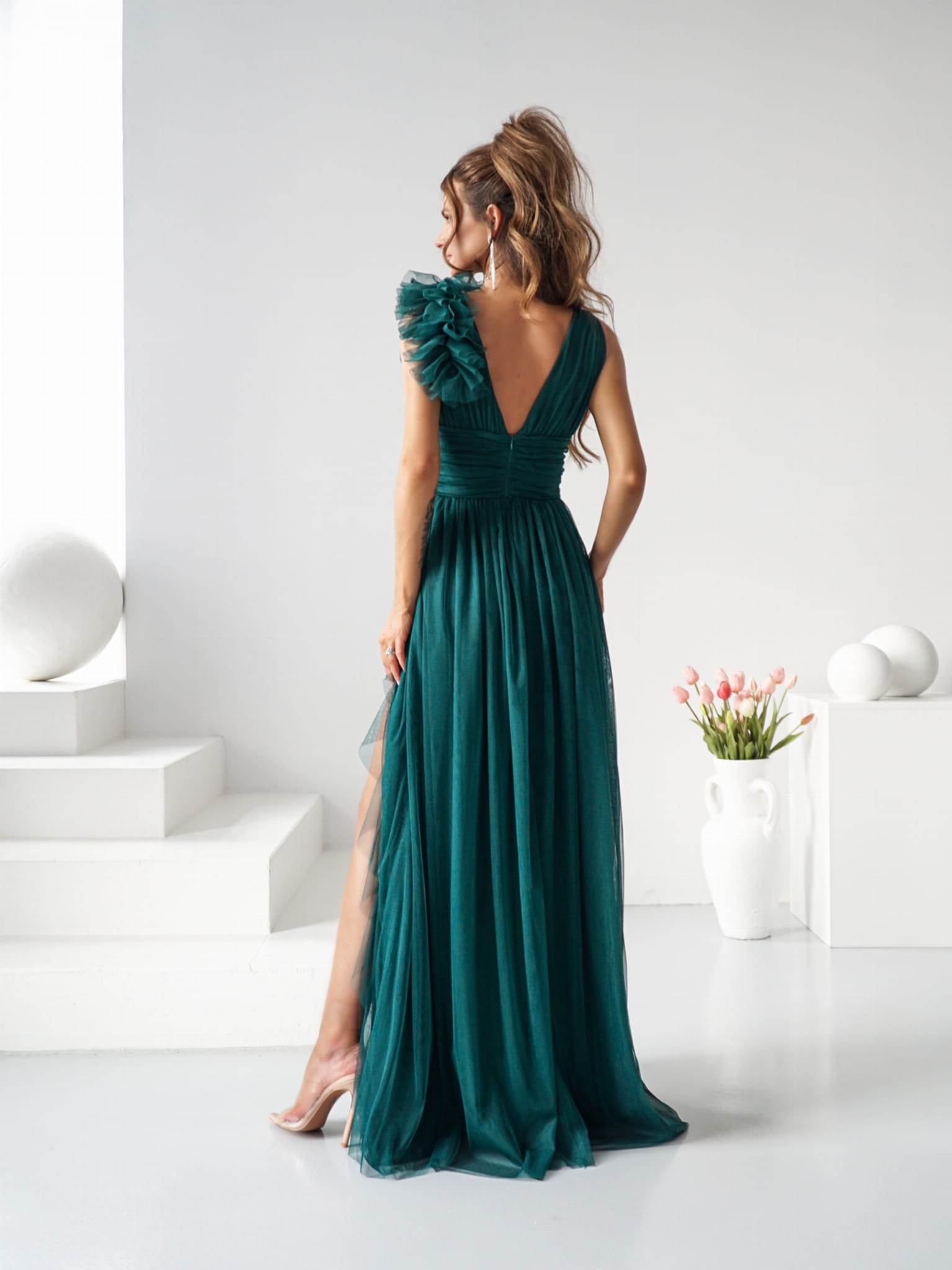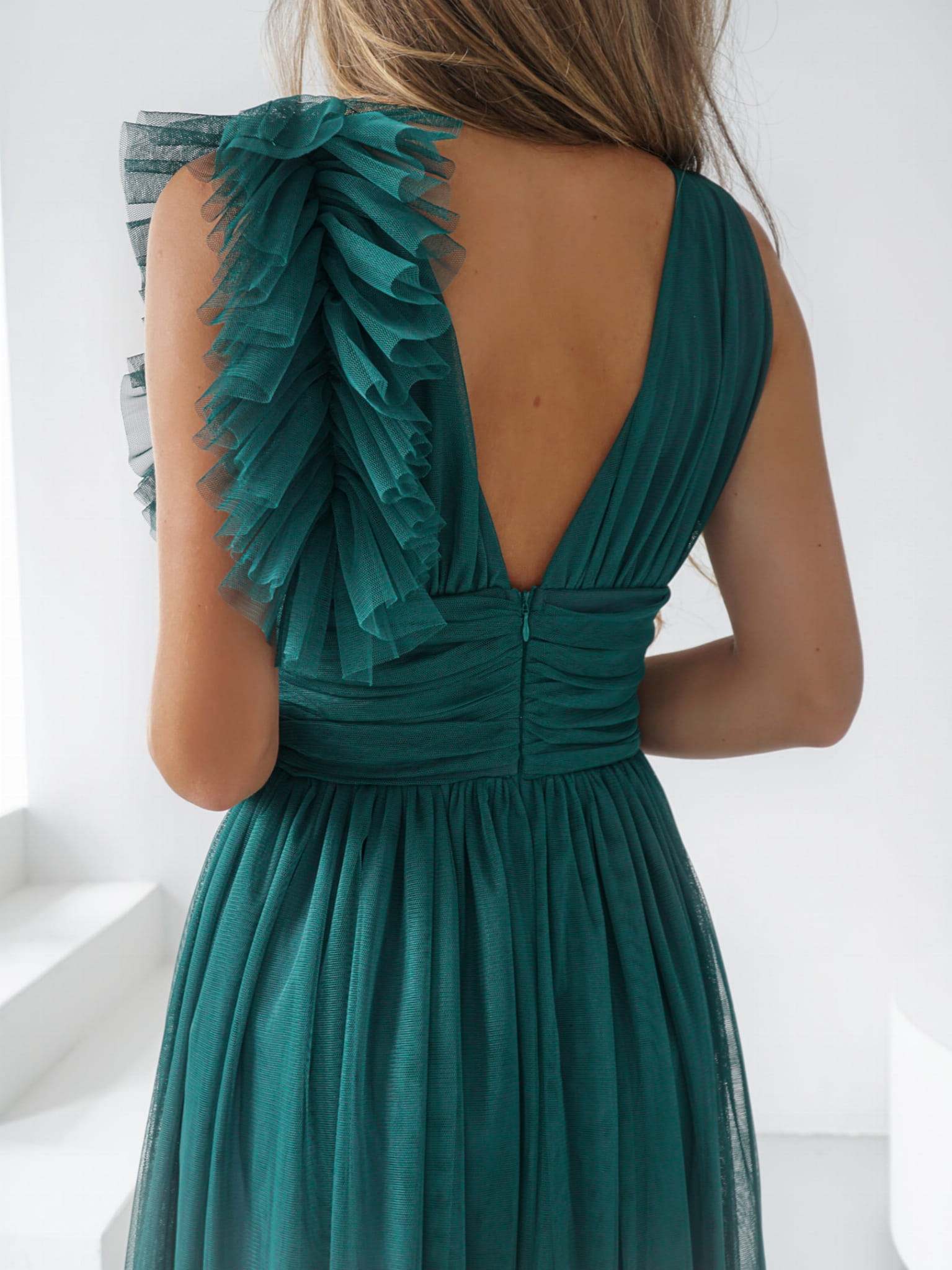 Odkryj wyjątkową suknię maxi z szerokimi ramiączkami, która łączy elegancję z nowoczesnym stylem. Suknia zachwyca lekkością i delikatnością. Uszyta z wysokiej jakości tiulowej siatki. Efektowna ozdoba na ramieniu dodaje jej niepowtarzalnego charakteru, sprawiając, że każda kobieta będzie czuła się w niej jak prawdziwa gwiazda.
