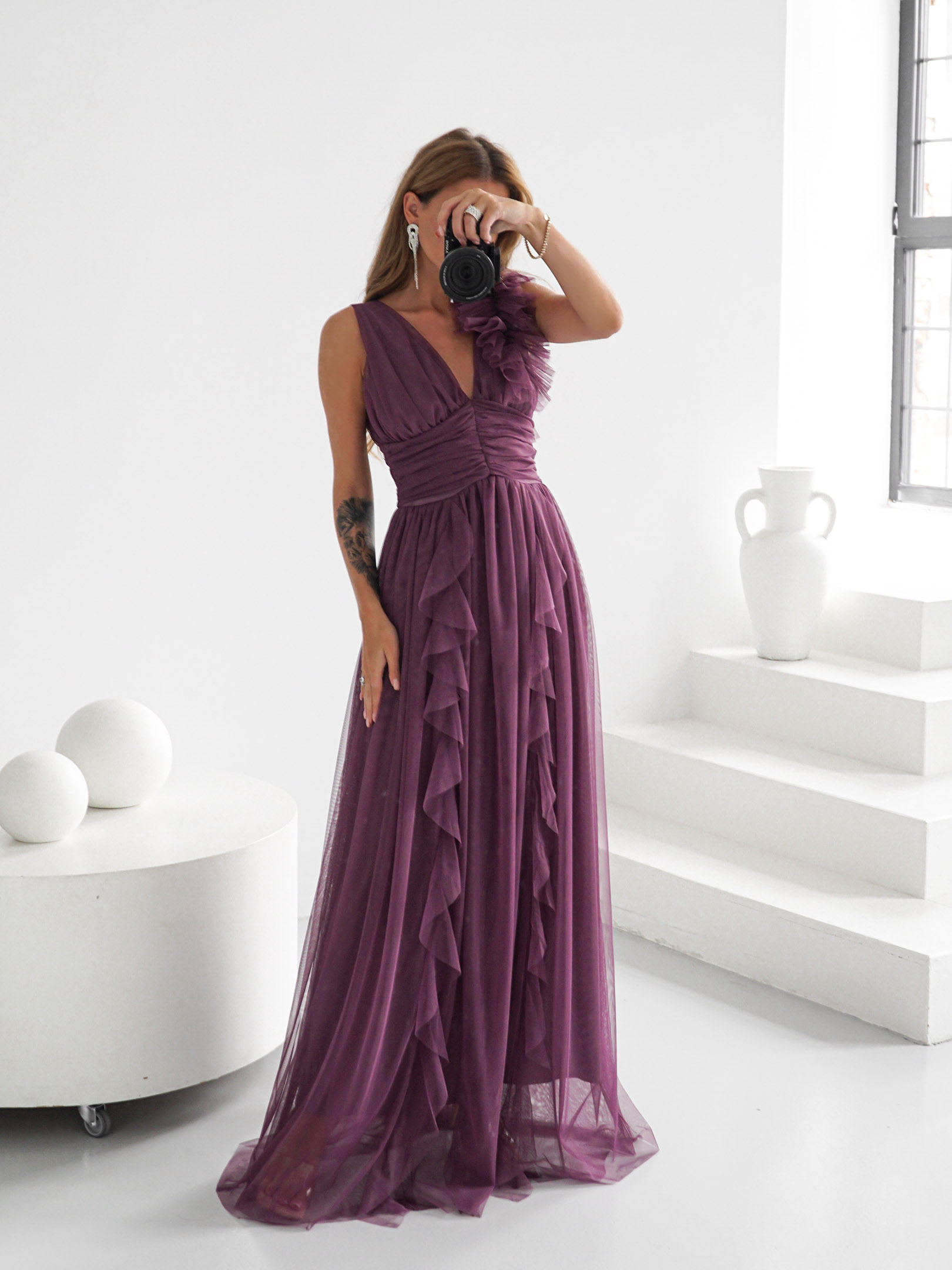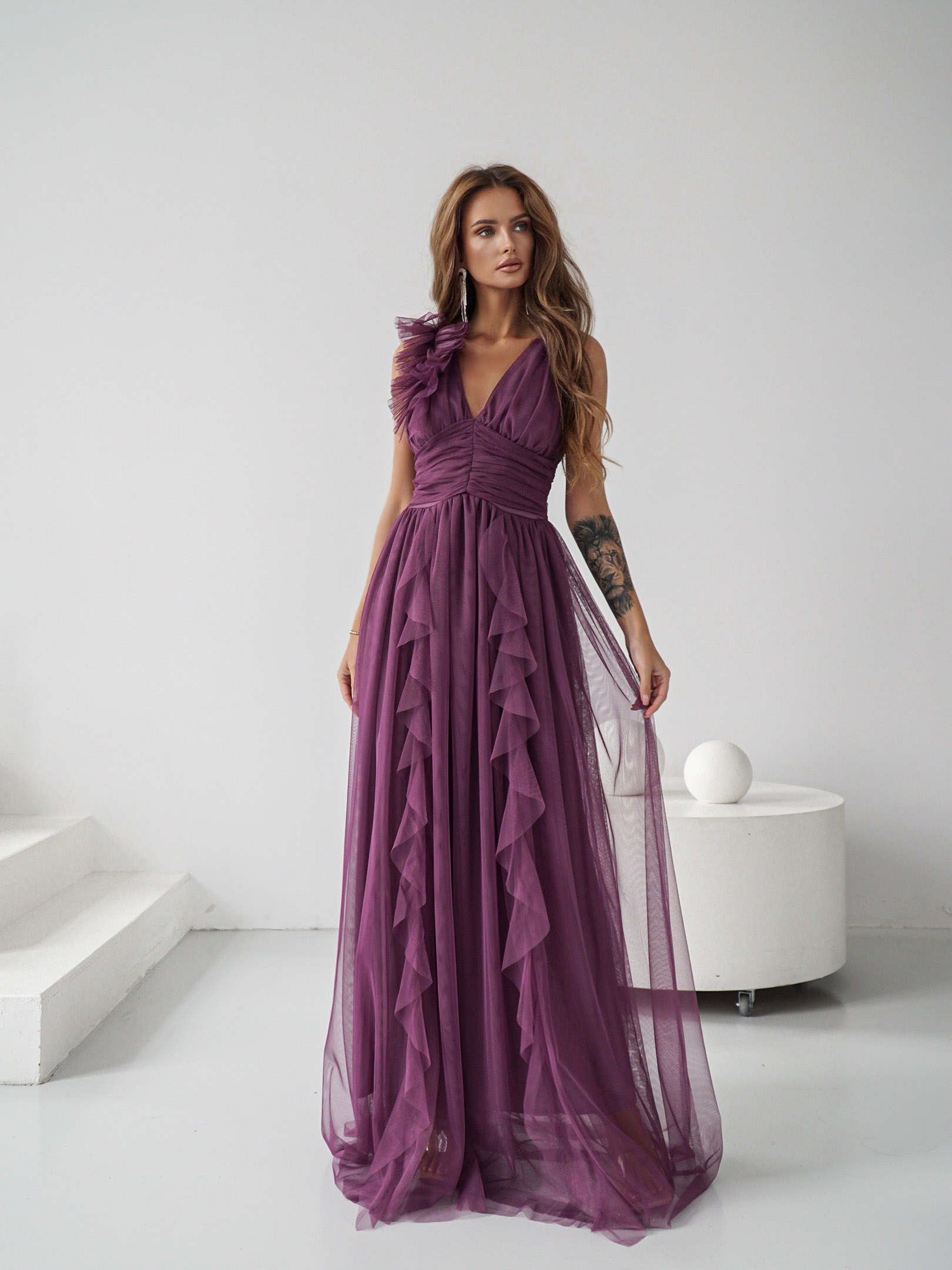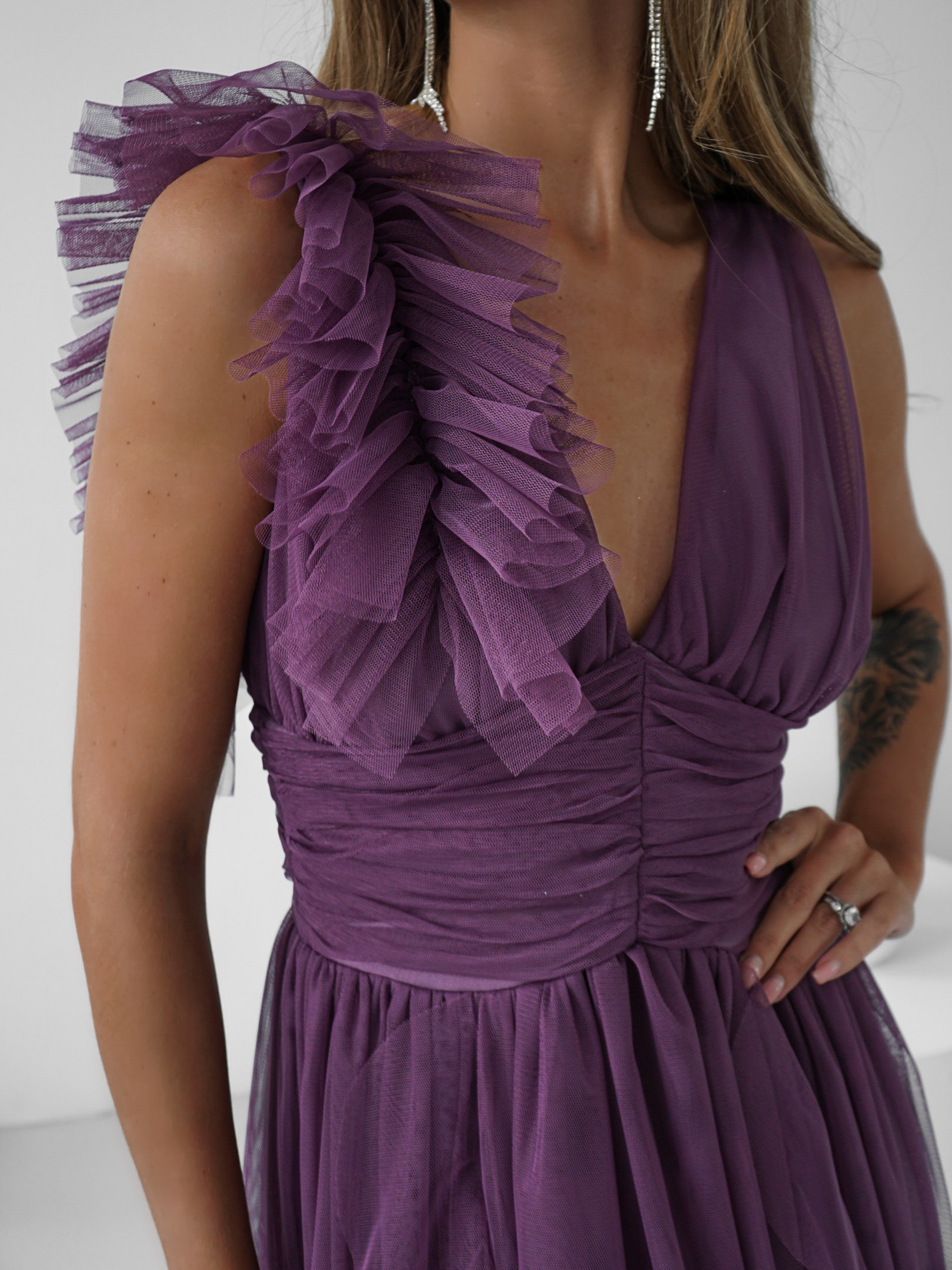 Odkryj wyjątkową suknię maxi z szerokimi ramiączkami, która łączy elegancję z nowoczesnym stylem. Suknia zachwyca lekkością i delikatnością. Uszyta z wysokiej jakości tiulowej siatki. Efektowna ozdoba na ramieniu dodaje jej niepowtarzalnego charakteru, sprawiając, że każda kobieta będzie czuła się w niej jak prawdziwa gwiazda.