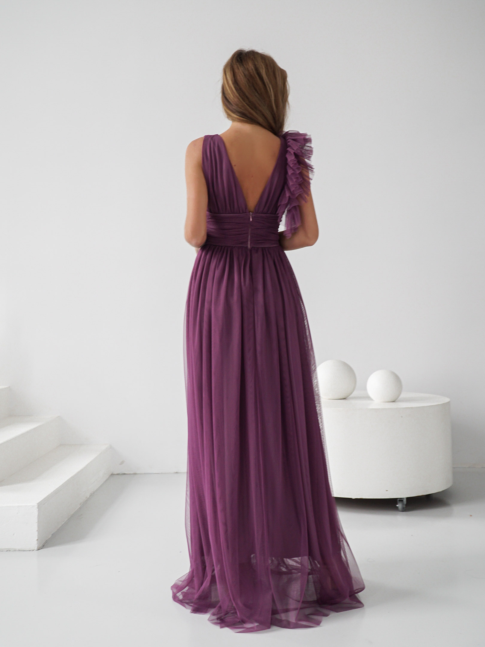 Rozkloszowana spódnica z falbankami pięknie podkreśla sylwetkę, a dwie warstwy tiulu oraz podszewka zapewniają komfort noszenia. Dodatkowo, subtelny rozporek odsłaniający nogę dodaje całości zmysłowości. Suknia ma wszyte miseczki co pozwala na idealne dopasowanie do biustu.