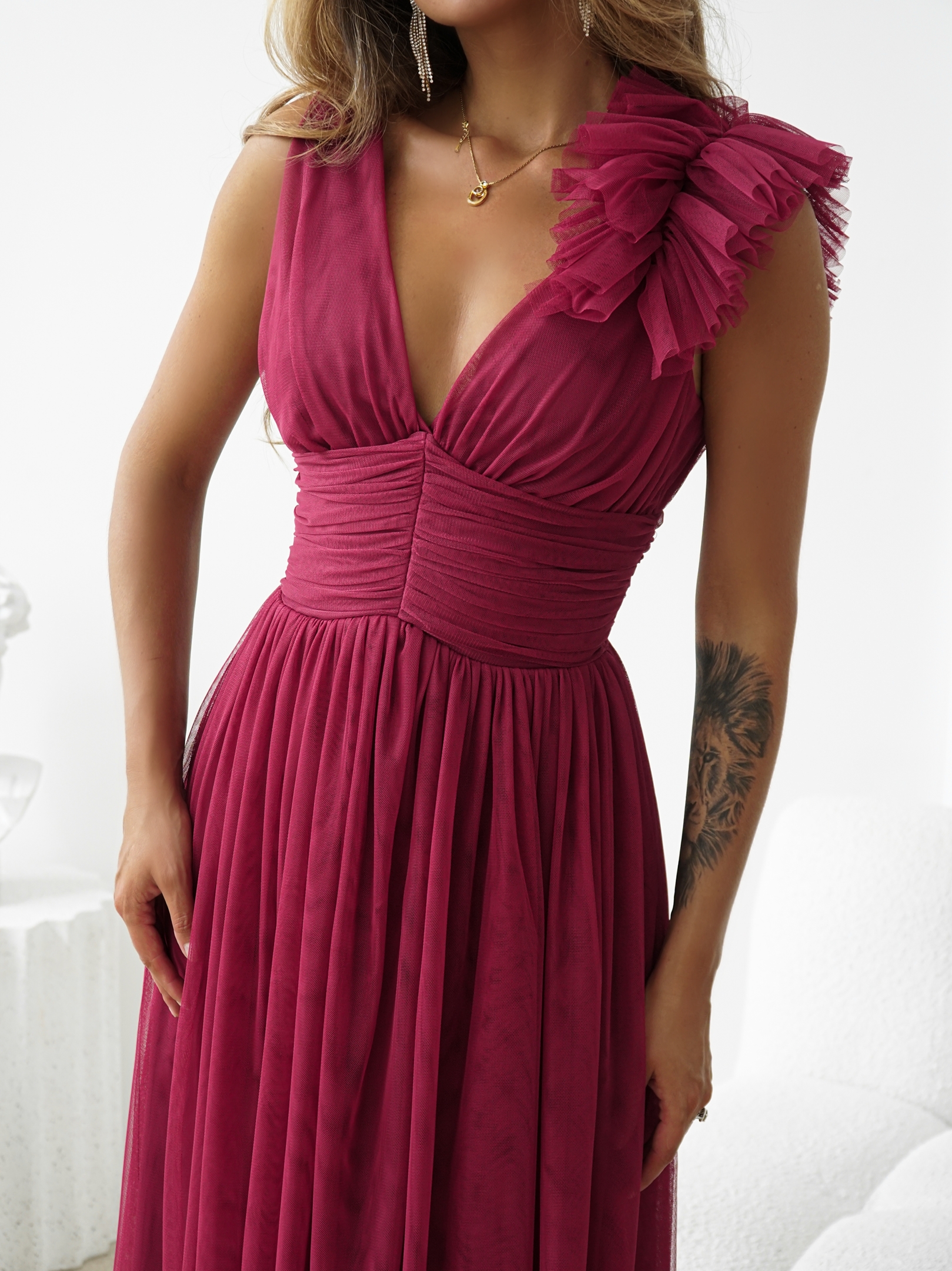 Odkryj wyjątkową suknię midi z szerokimi ramiączkami, która łączy elegancję z nowoczesnym stylem. Suknia zachwyca lekkością i delikatnością. Uszyta z wysokiej jakości tiulowej siatki. Efektowna ozdoba na ramieniu dodaje jej niepowtarzalnego charakteru, sprawiając, że każda kobieta będzie czuła się w niej jak prawdziwa gwiazda.