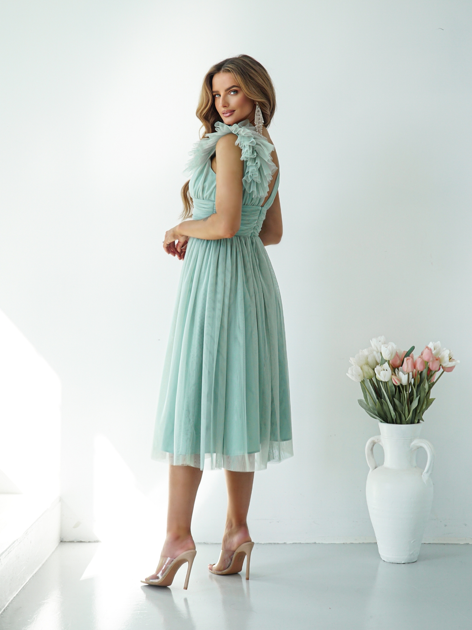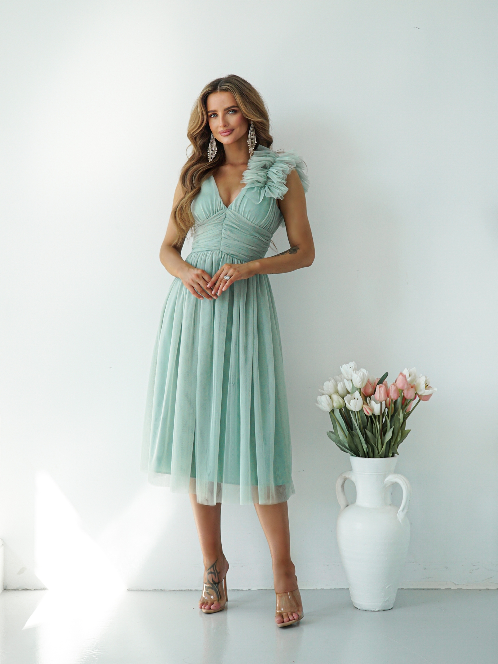 Odkryj wyjątkową suknię midi z szerokimi ramiączkami, która łączy elegancję z nowoczesnym stylem. Suknia zachwyca lekkością i delikatnością. Uszyta z wysokiej jakości tiulowej siatki. Efektowna ozdoba na ramieniu dodaje jej niepowtarzalnego charakteru, sprawiając, że każda kobieta będzie czuła się w niej jak prawdziwa gwiazda.