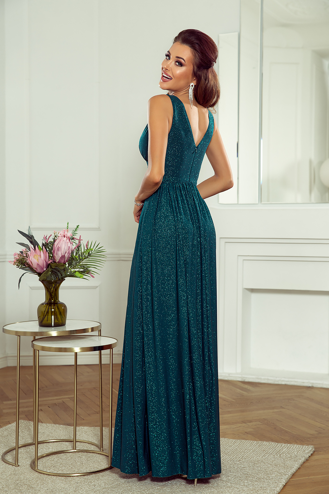 Sukienka wykonana z przyjemnego w dotyku materiału, który dopasowuje się do ciała. Drobinki brokatu na materiale sprawiają, że suknia robi niesamowite wrażenie.