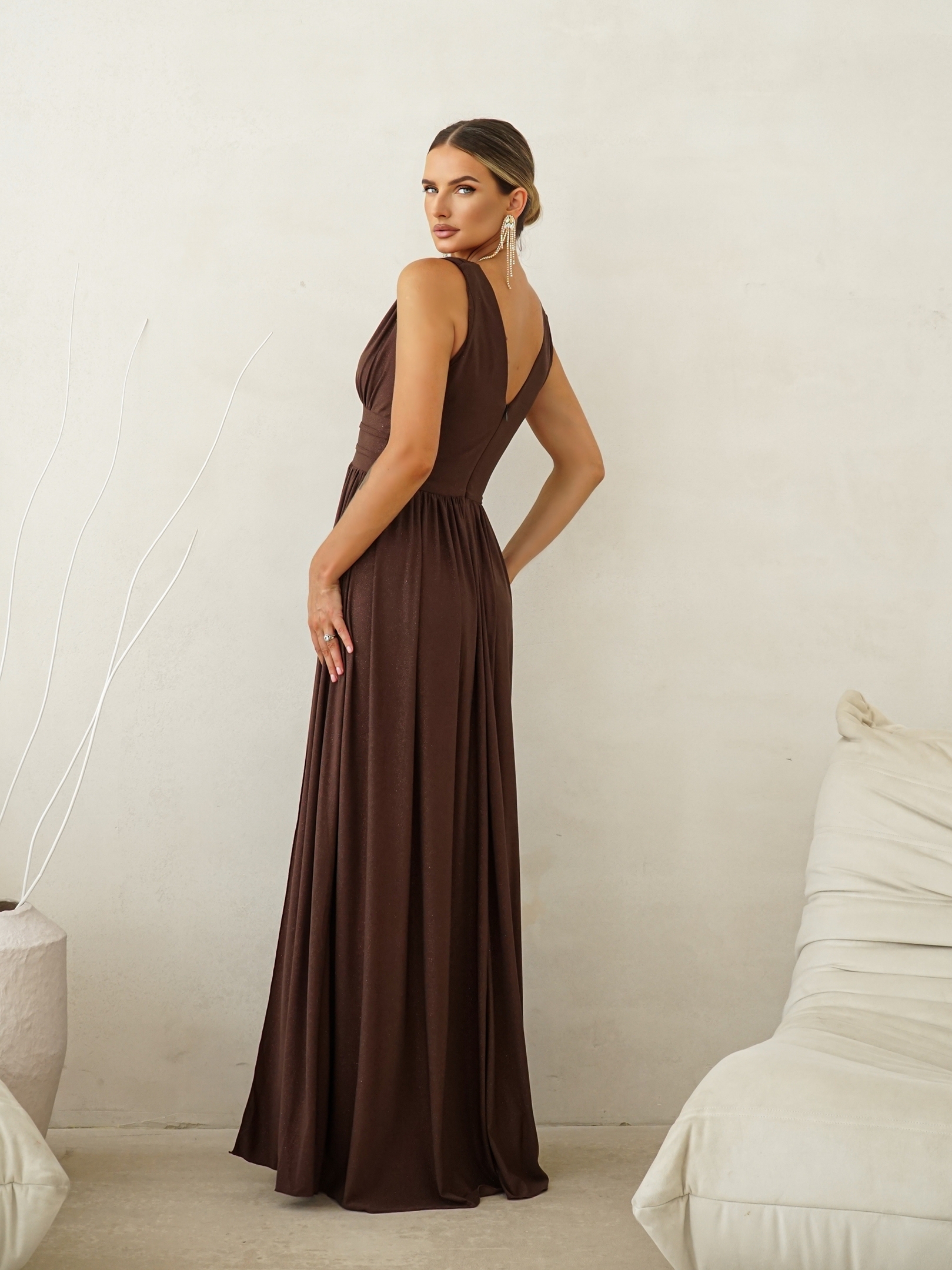 Zjawiskowa suknia zdobiona drobinkami brokatu.