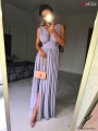 Szeroki pas z ozdobnymi paseczkami wspaniale zaznacza talie oraz podkreśla atuty sylwetki. Delikatny, zwiewny dół z rozcięciem pozwala wyeksponować nogę.